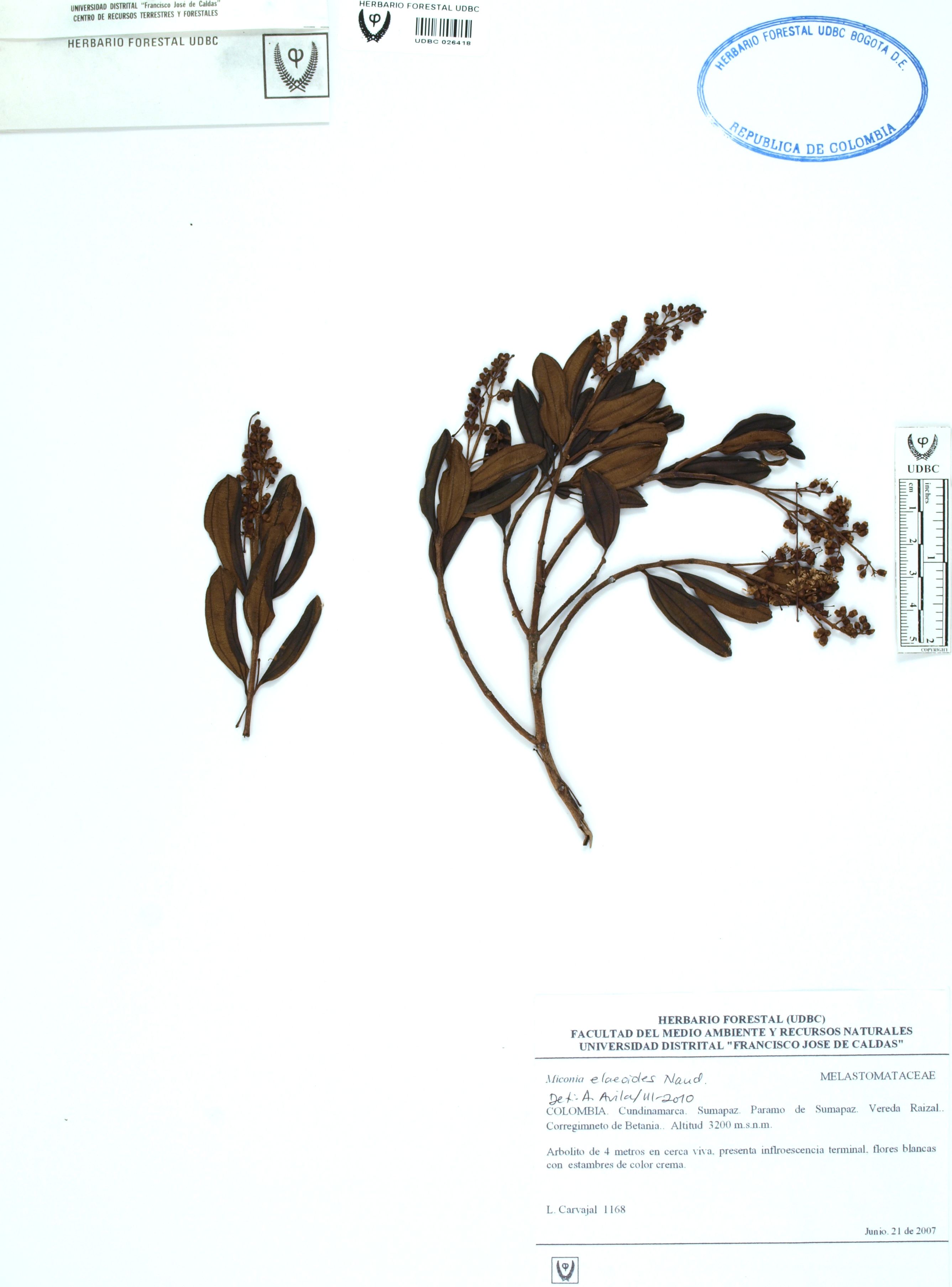 Fotografía del ejemplar Carvajal, L. 1168, determinado como Miconia elaeoides en el año 2010
