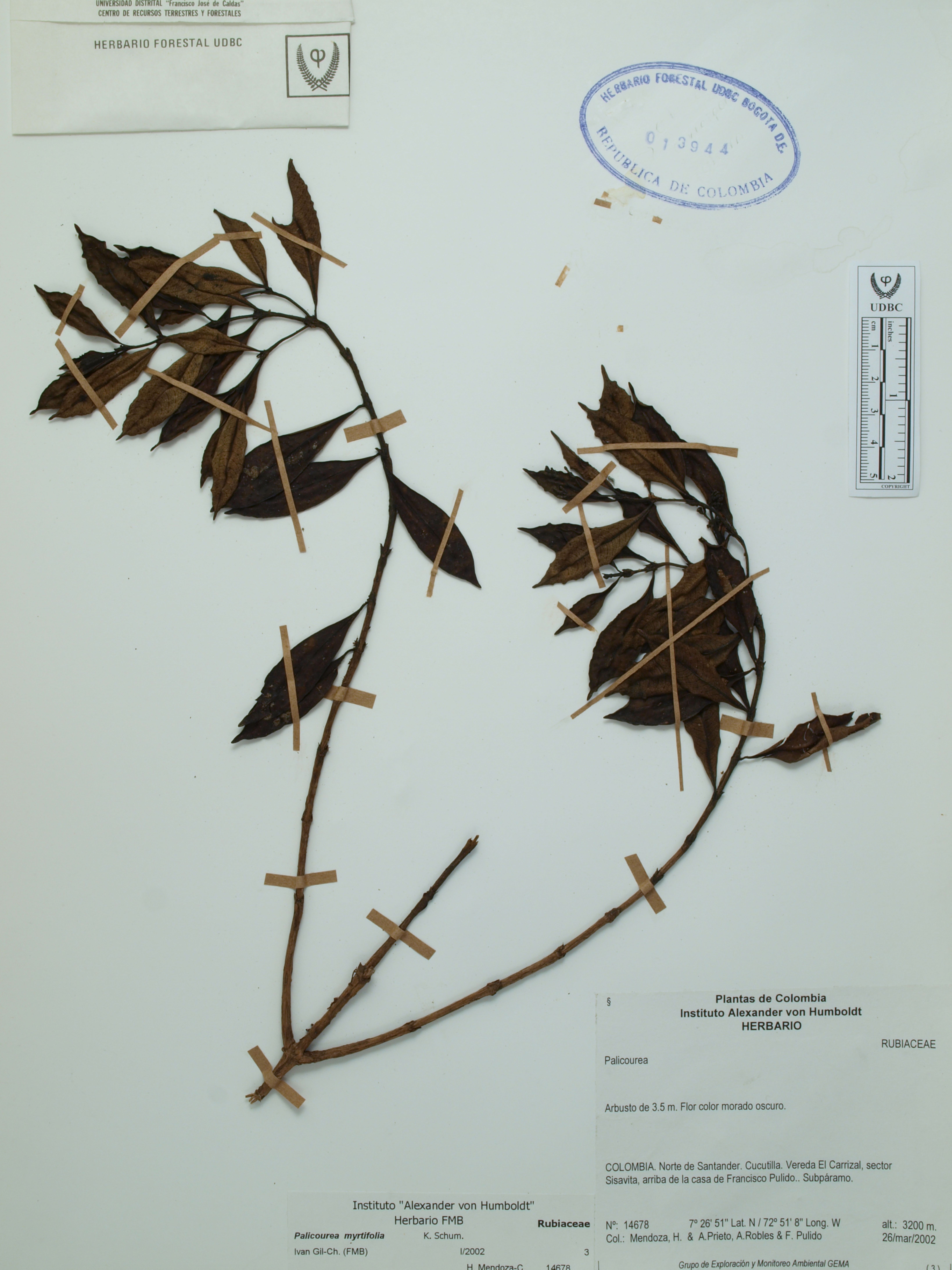 Fotografía del ejemplar Mendoza, H. 14678, determinado como Palicourea myrtifolia en el año 2002
