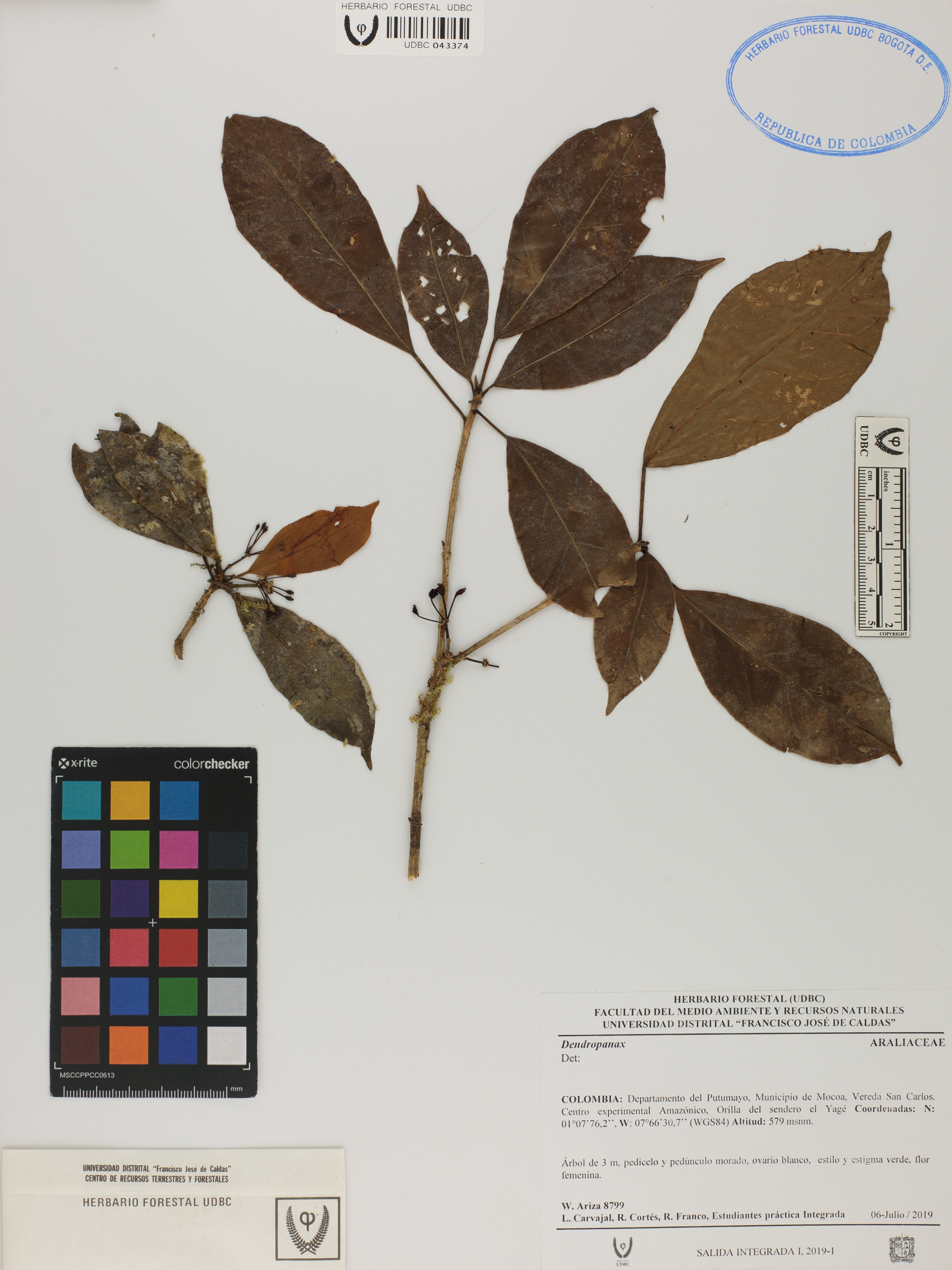 | dc.description | Fotografía del ejemplar Ariza, W. 8799, determinado como Dendropanax sp. | |