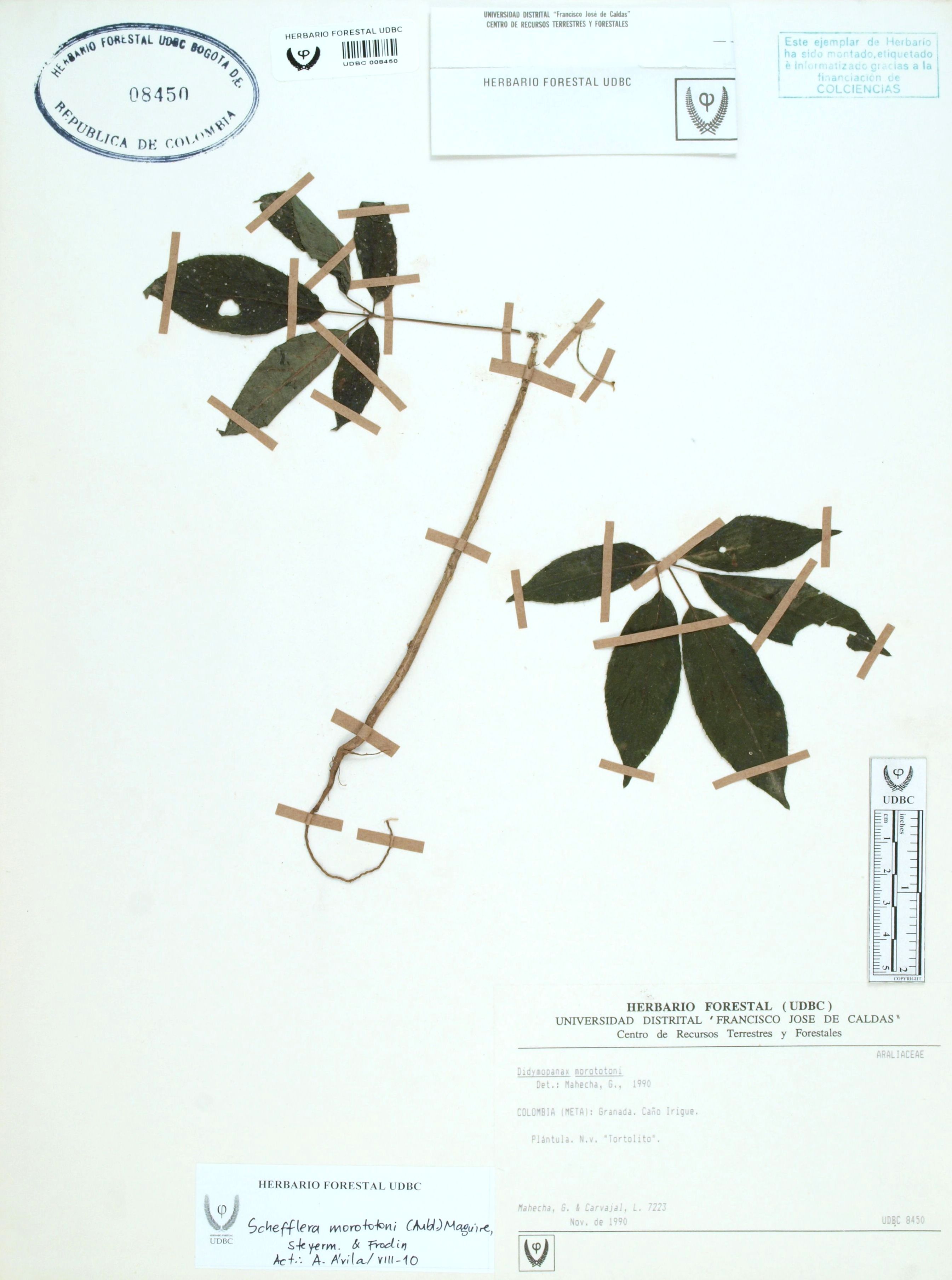 Fotografía del ejemplar Mahecha, G. 7223, determinado como Didymopanax morototoni en el año 2010