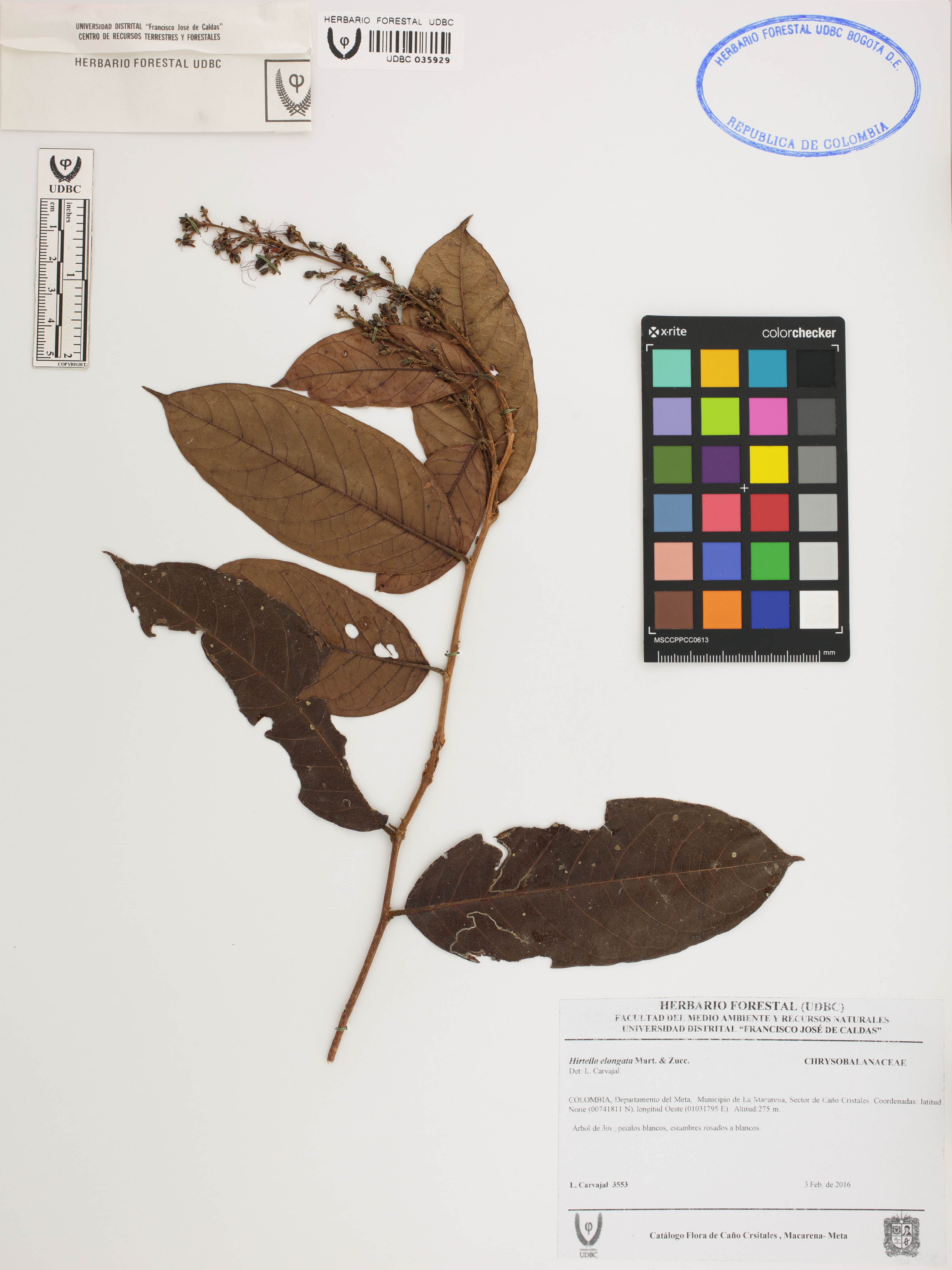 Fotografía del ejemplar Carvajal, L. 3553, determinado como Hirtella elongata