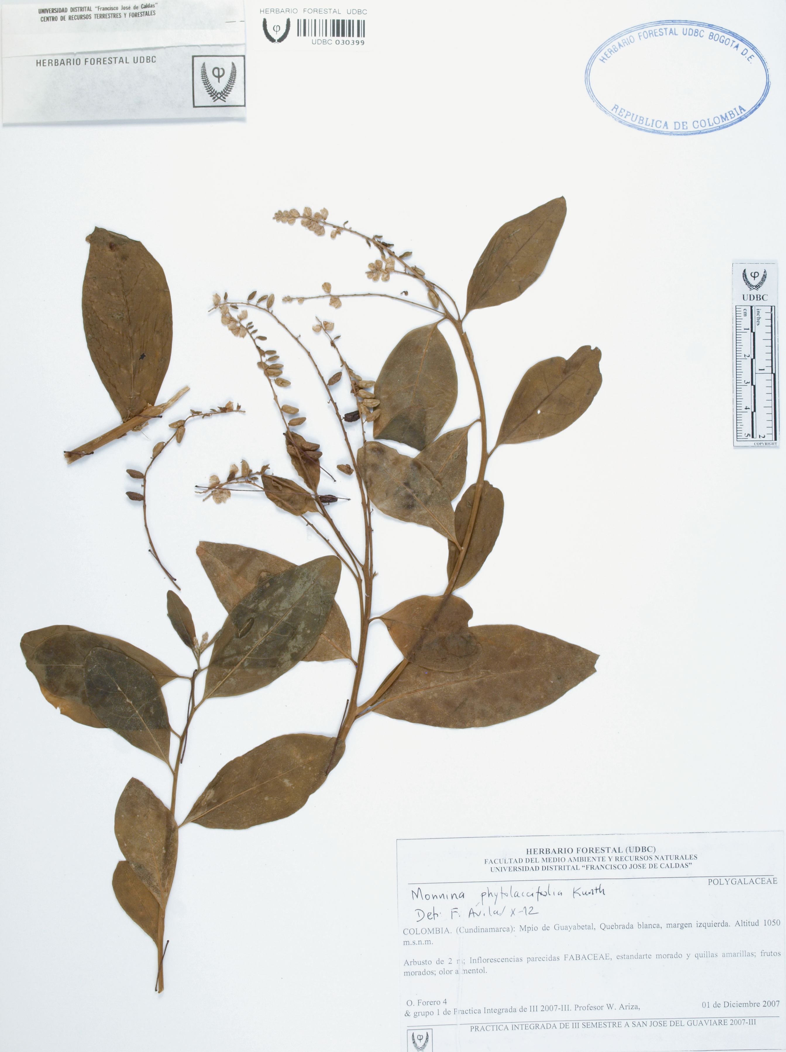 Fotografía del ejemplar Forero, O. 4, determinado como Monnina phytolaccifolia en el año 2012