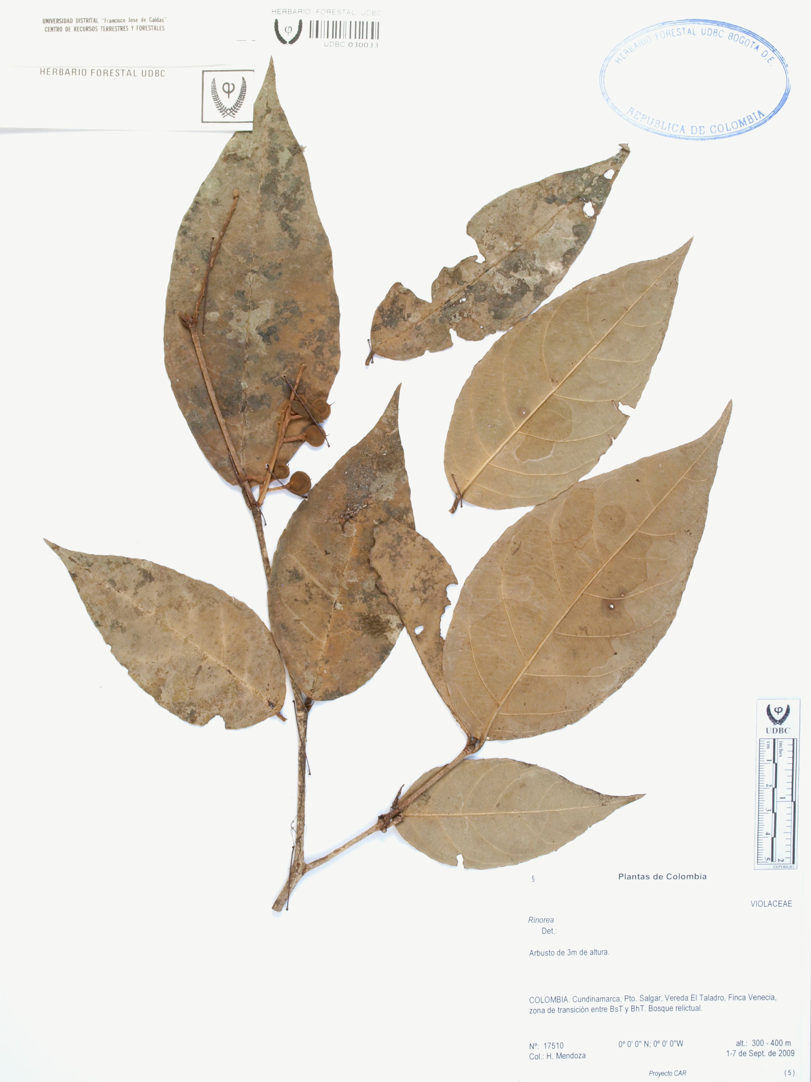 Fotografía del ejemplar Mendoza, H. 17510, determinado como Rinorea sp.