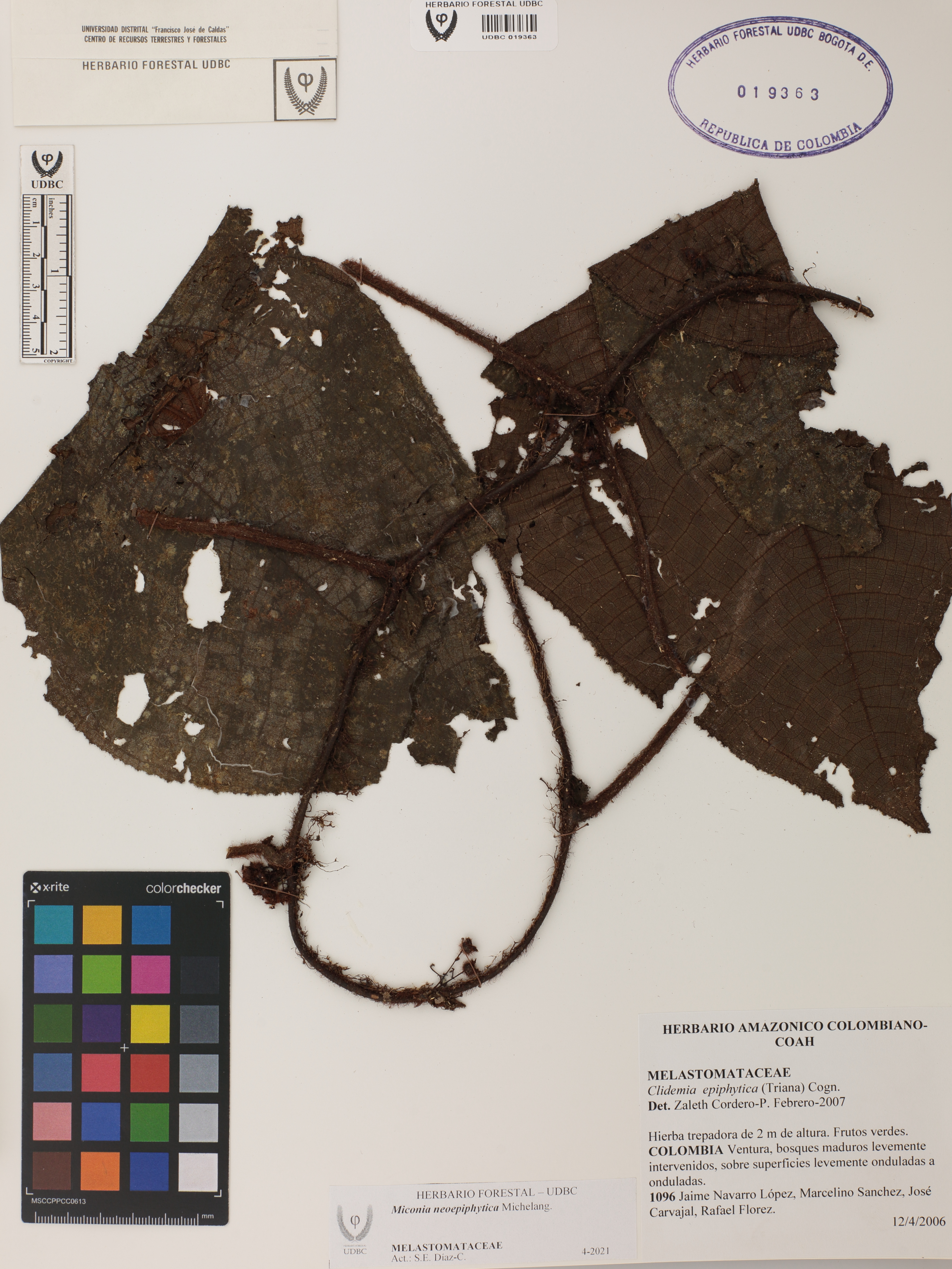 Fotografía del ejemplar Navarro, J. 1096, determinado como Miconia neoepiphytica en el año 2007