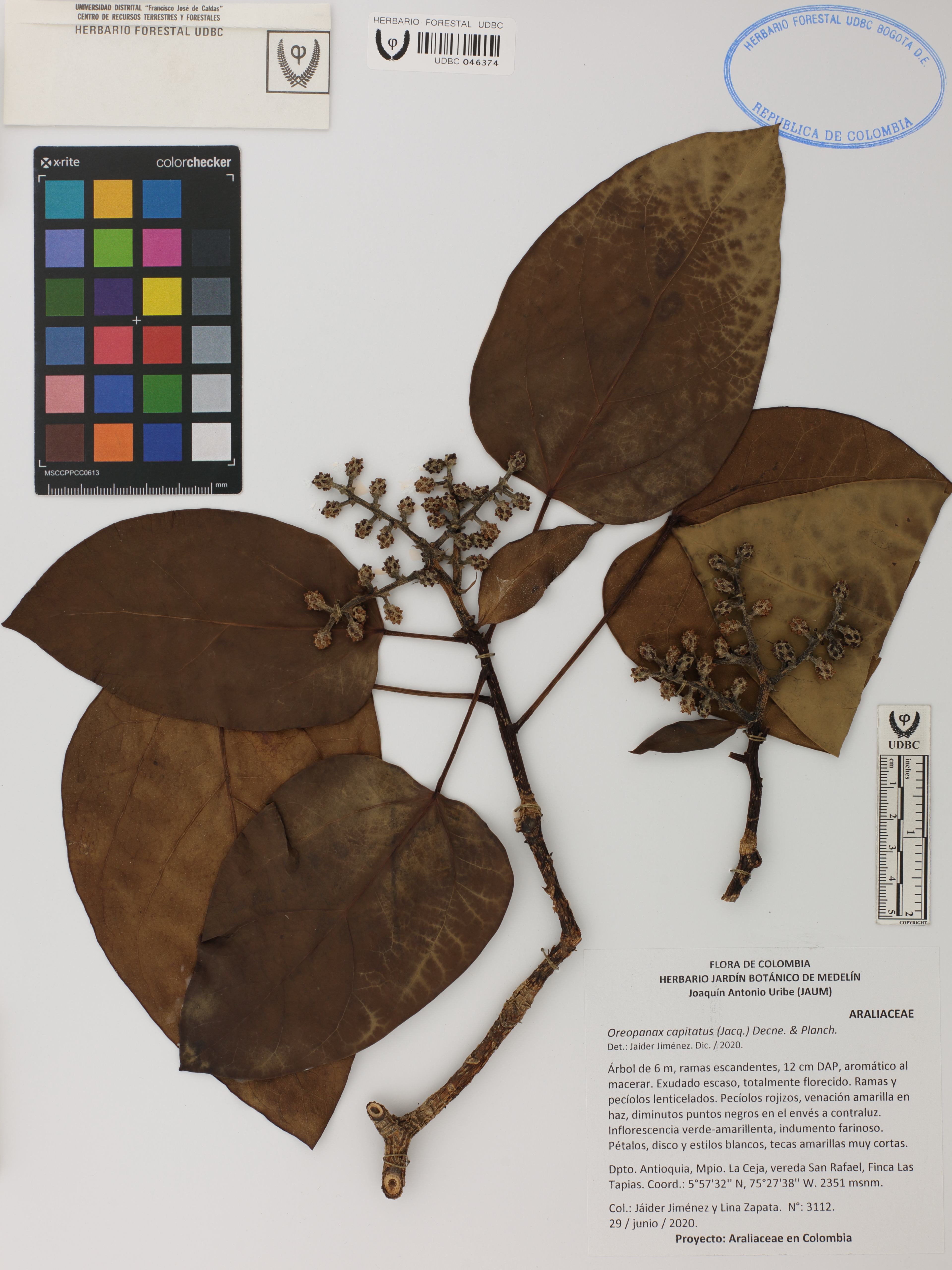 | dc.description | Fotografía del ejemplar Jiménez, J. 3112, determinado como Oreopanax capitatus en el año 2020 | |