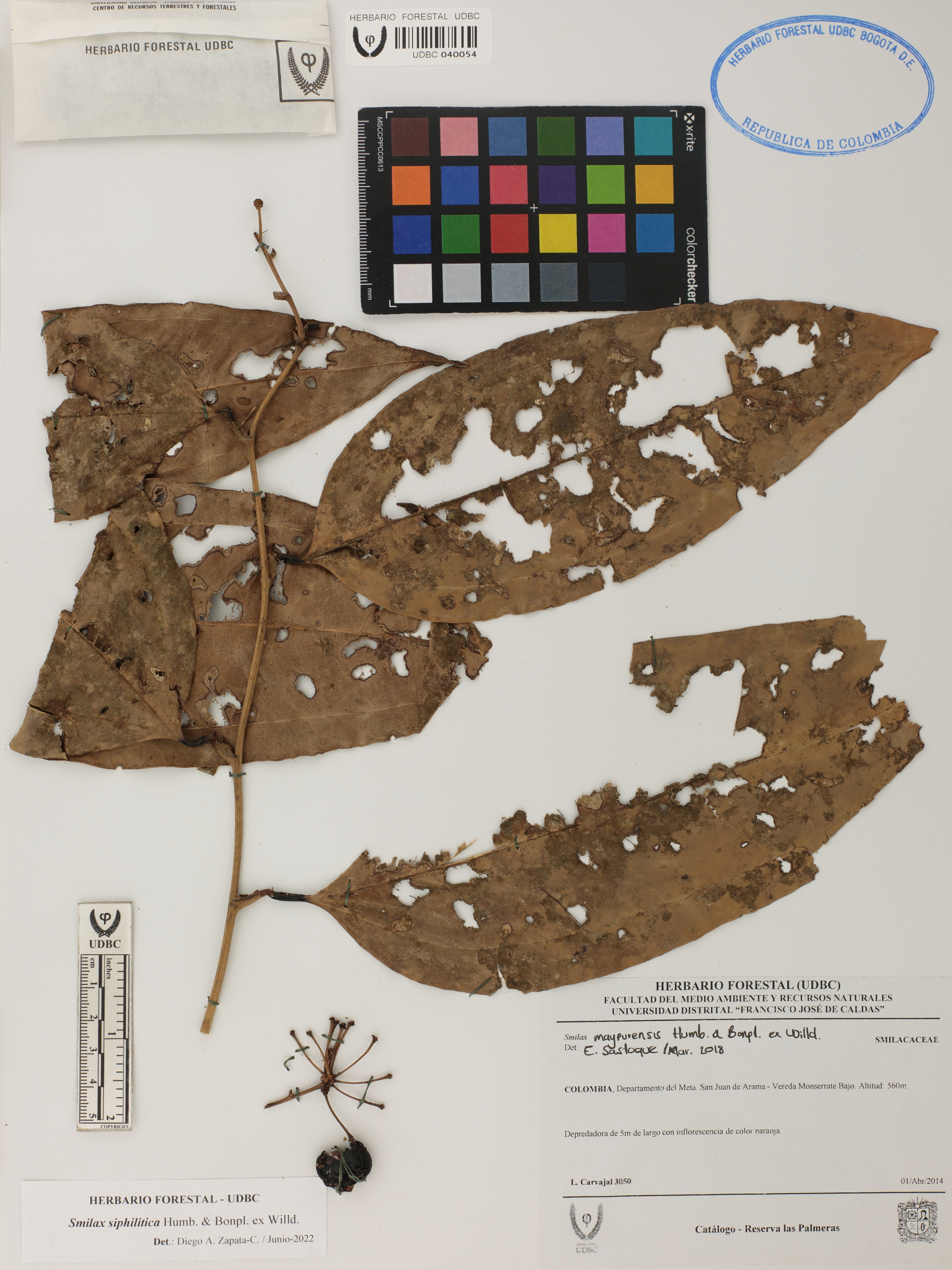 | dc.description | Fotografía del ejemplar Carvajal, L. 3050, determinado como Smilax siphilitica en el año 2022 | |