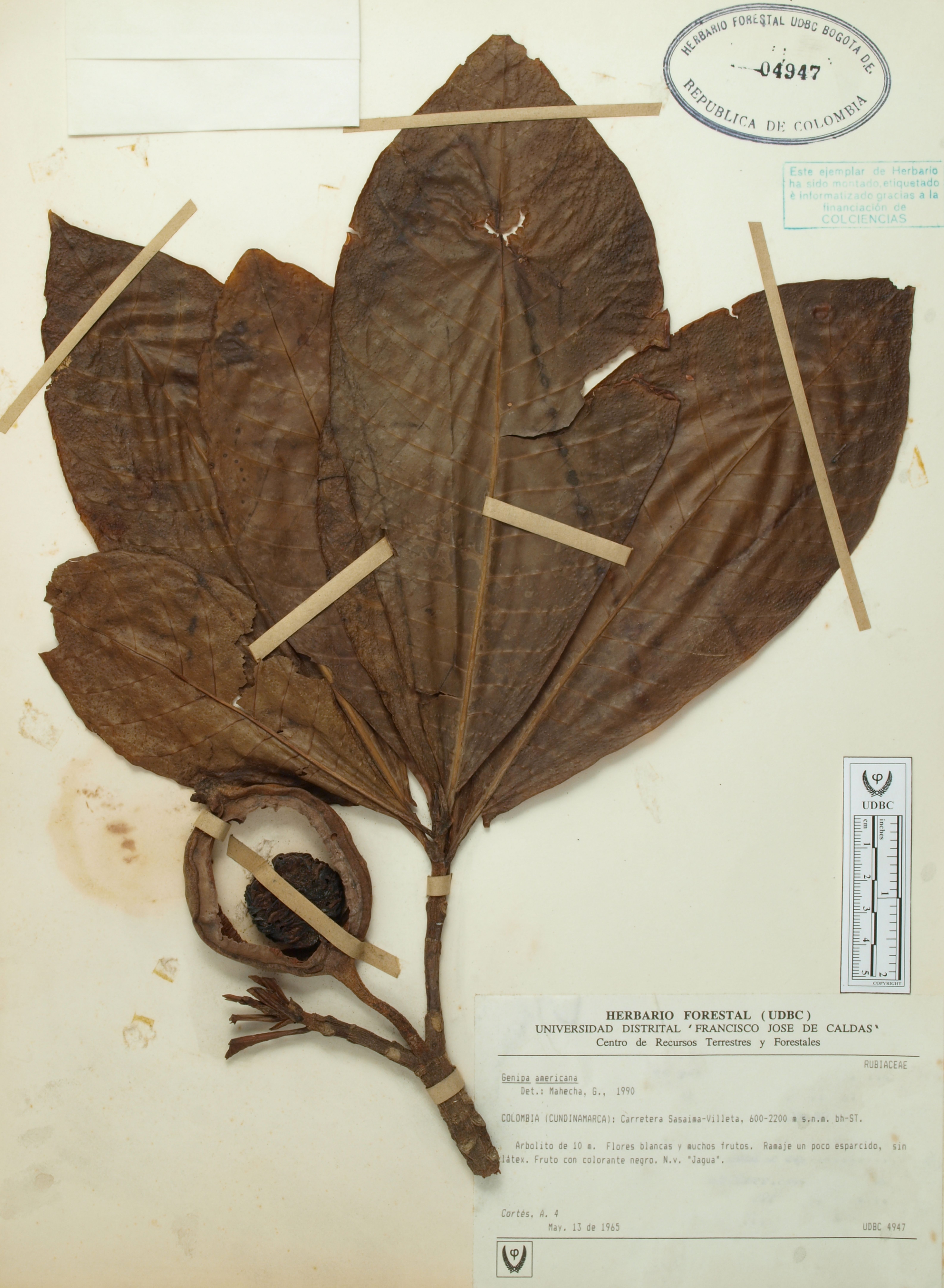 Fotografía del ejemplar Cortés, A. 4, determinado como Genipa americana en el año 1990