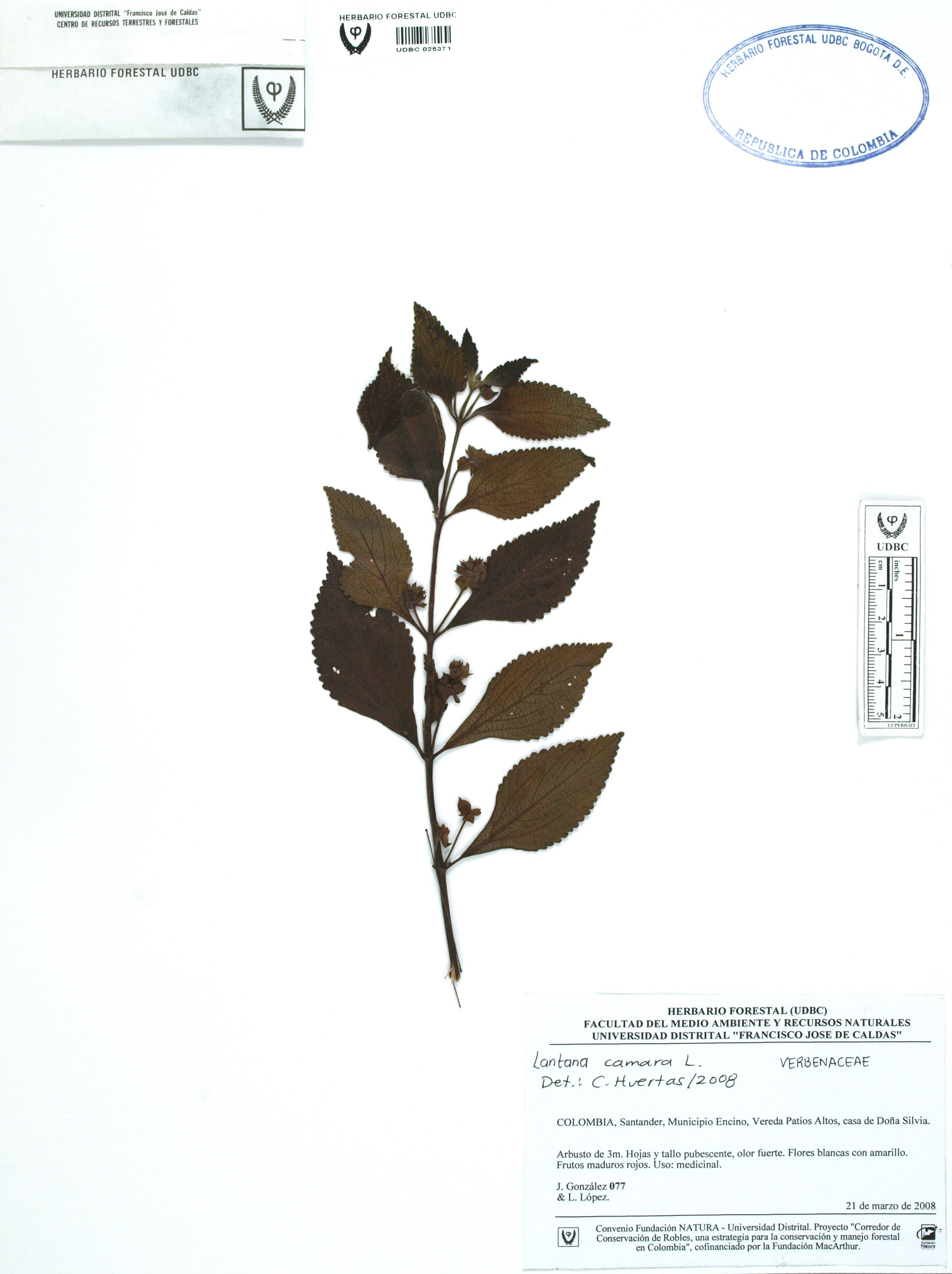 Fotografía del ejemplar González, J. 77, determinado como Lantana camara en el año 2008
