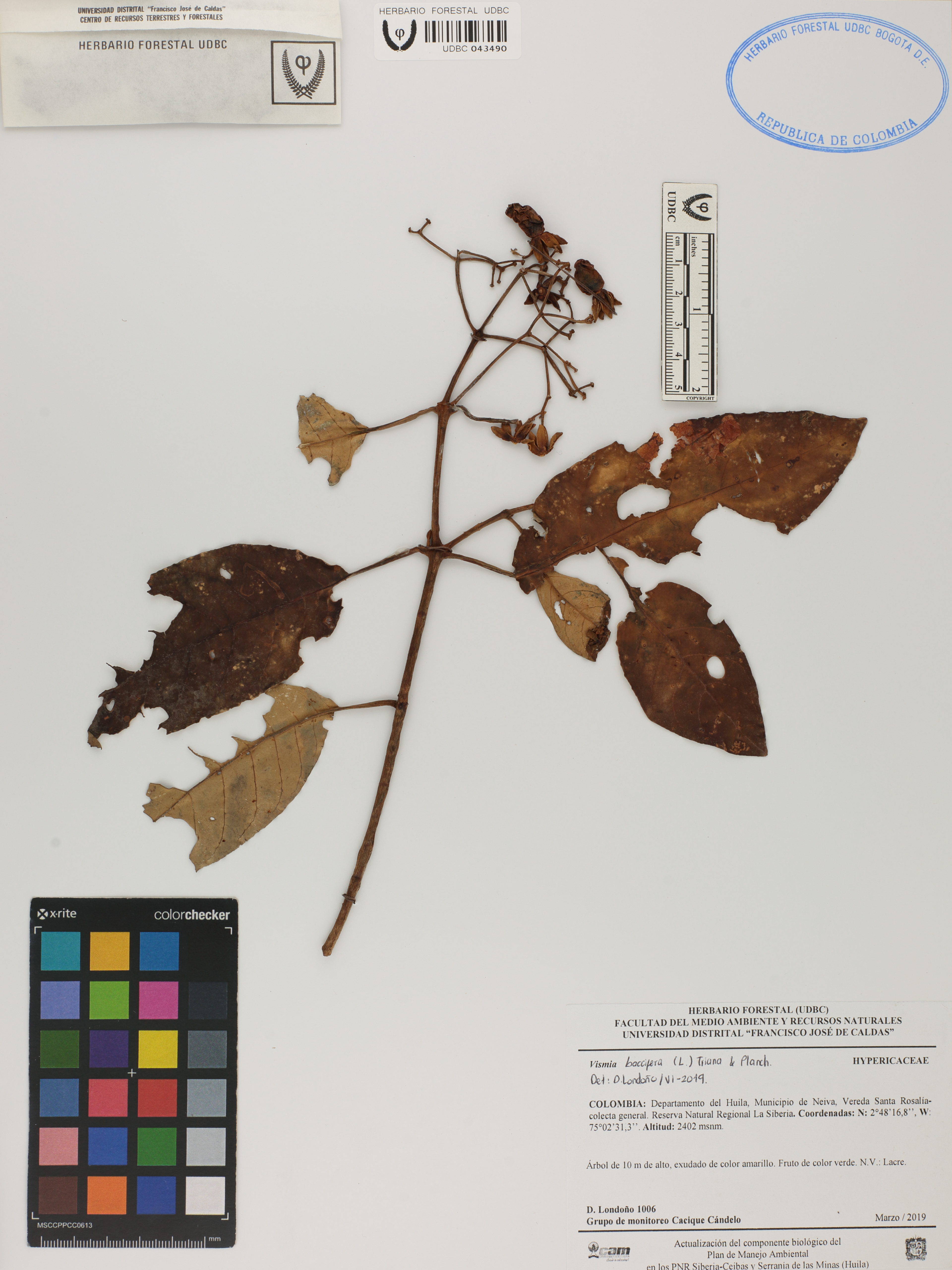 Fotografía del ejemplar Londoño, D. 1006, determinado como Vismia baccifera en el año 2019