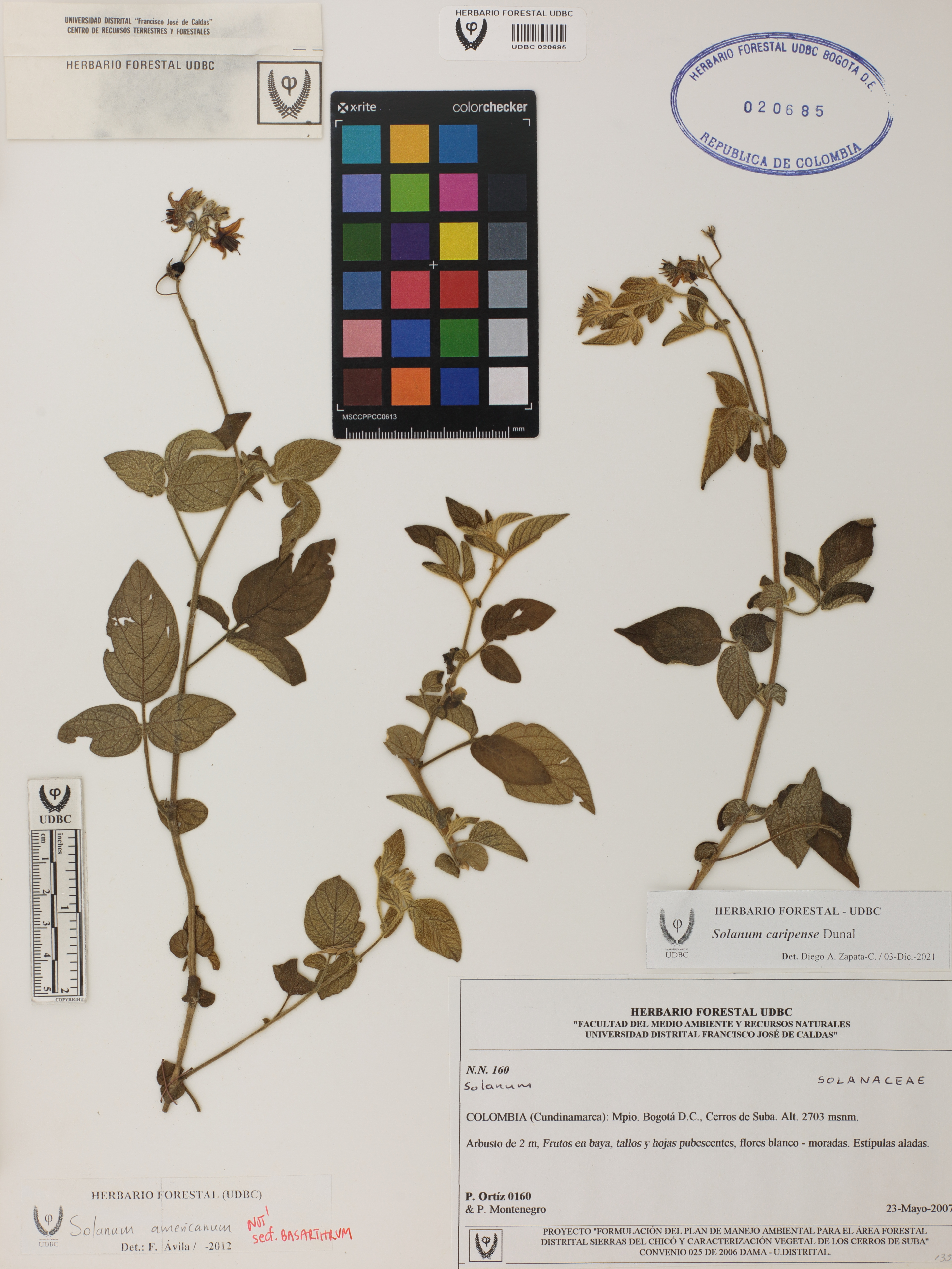 Fotografía del ejemplar Ortiz, P. 160, determinado como Solanum caripense en el año 2021