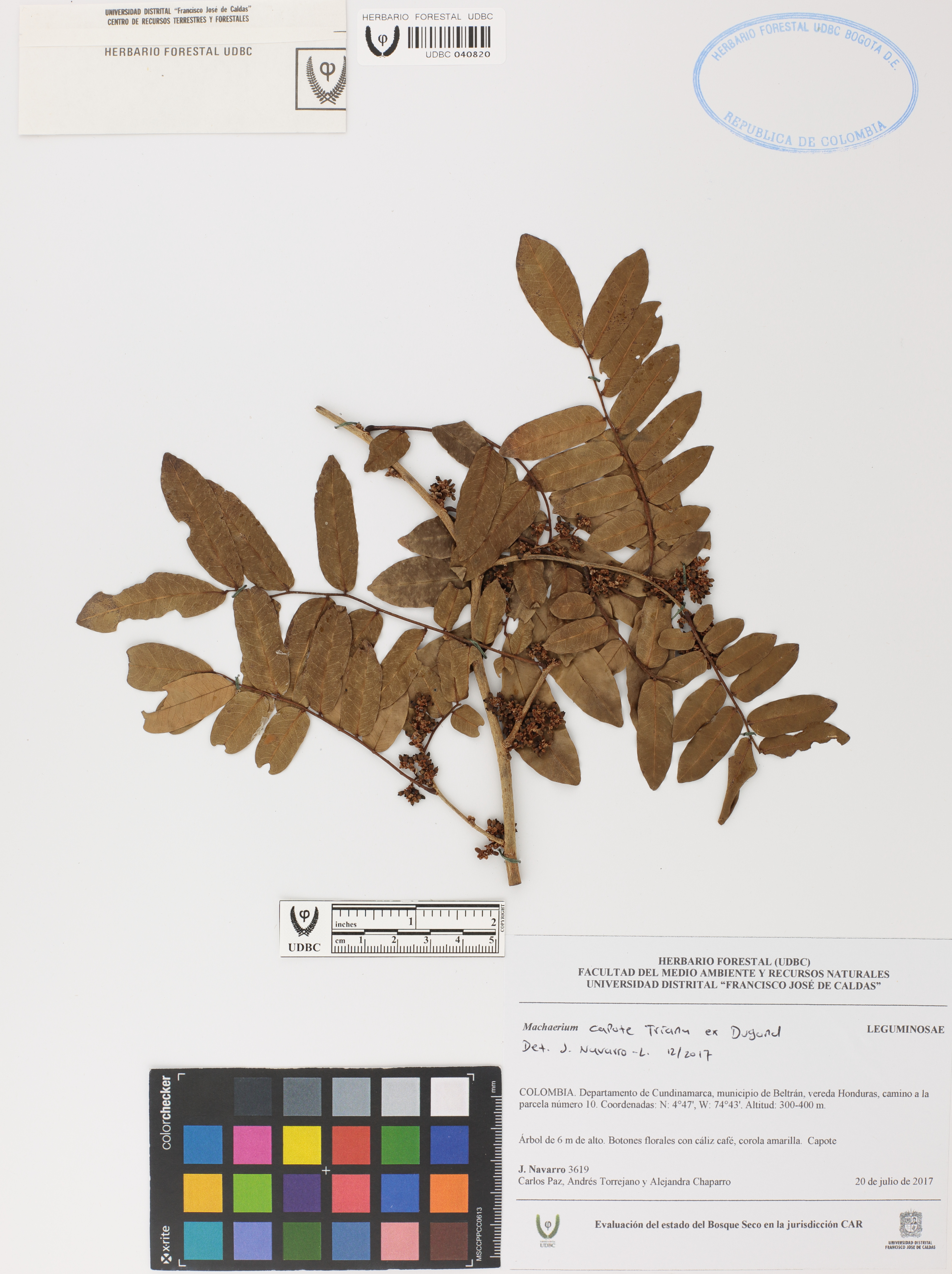 Fotografía del ejemplar Navarro, J. 3619, determinado como Machaerium capote en el año 2017