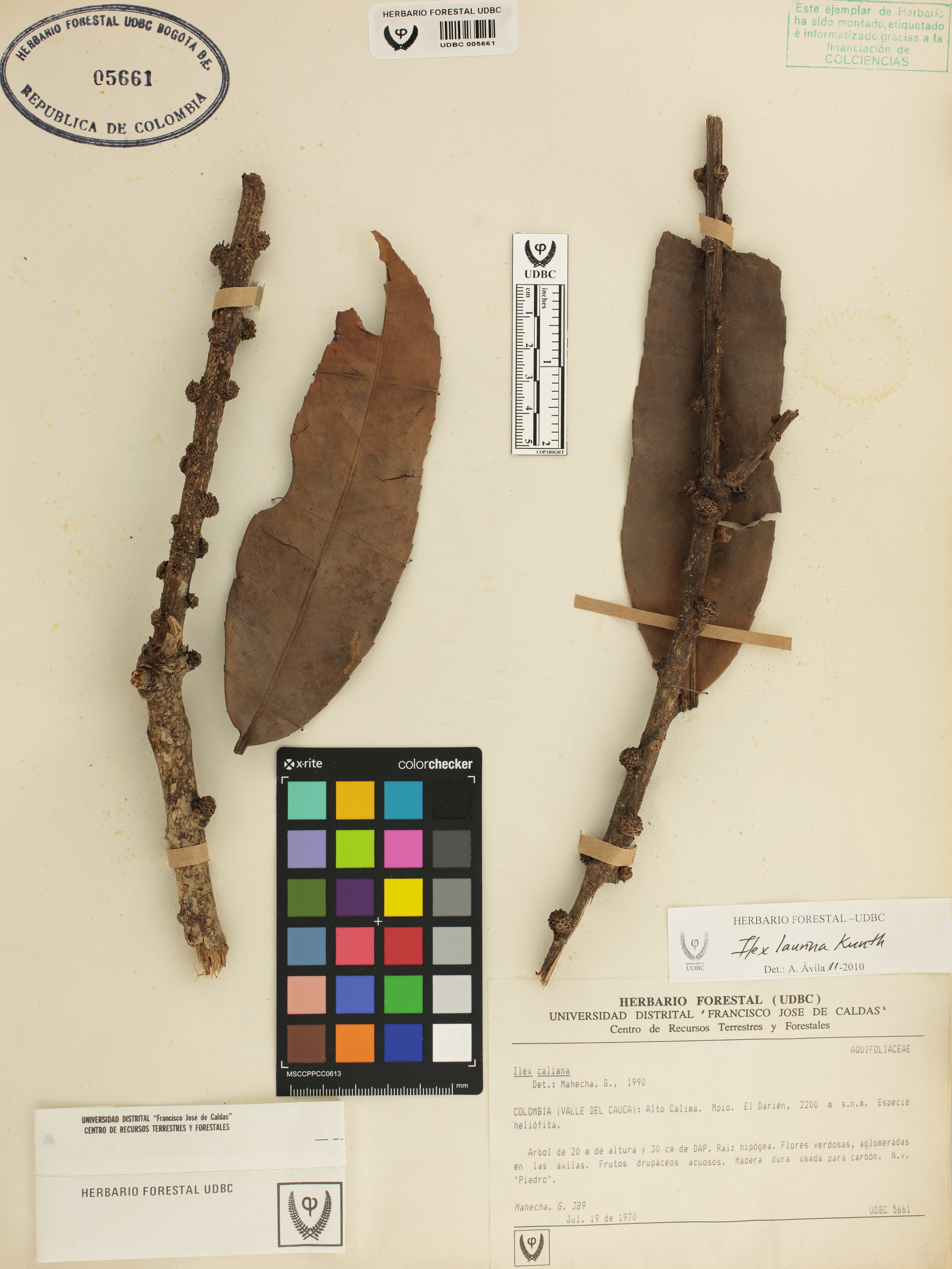 Fotografía del ejemplar Mahecha, G. 389, determinado como Ilex laurina en el año 2010