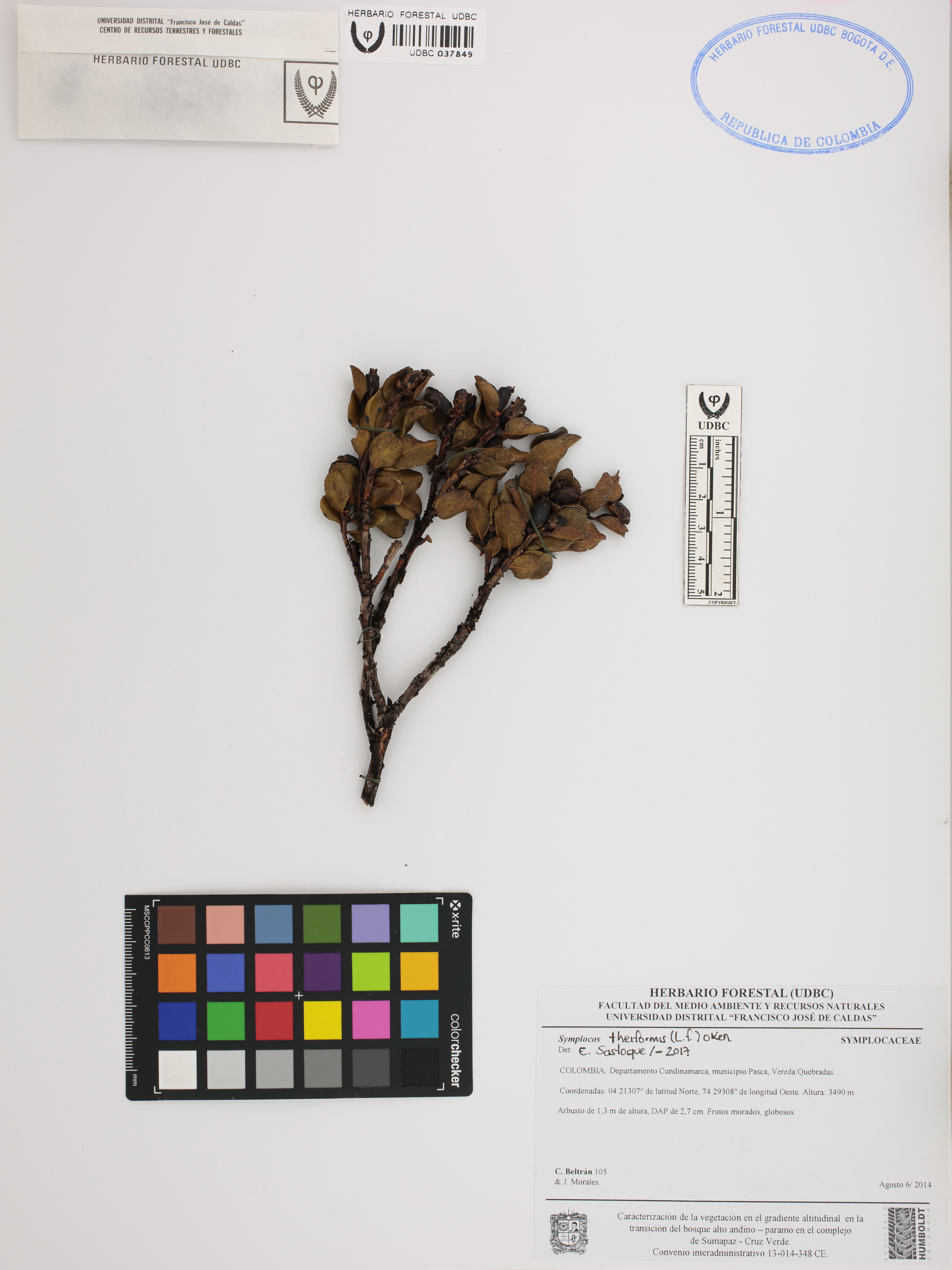 Fotografía del ejemplar Beltrán, C. 105, determinado como Symplocos theiformis en el año 2017
