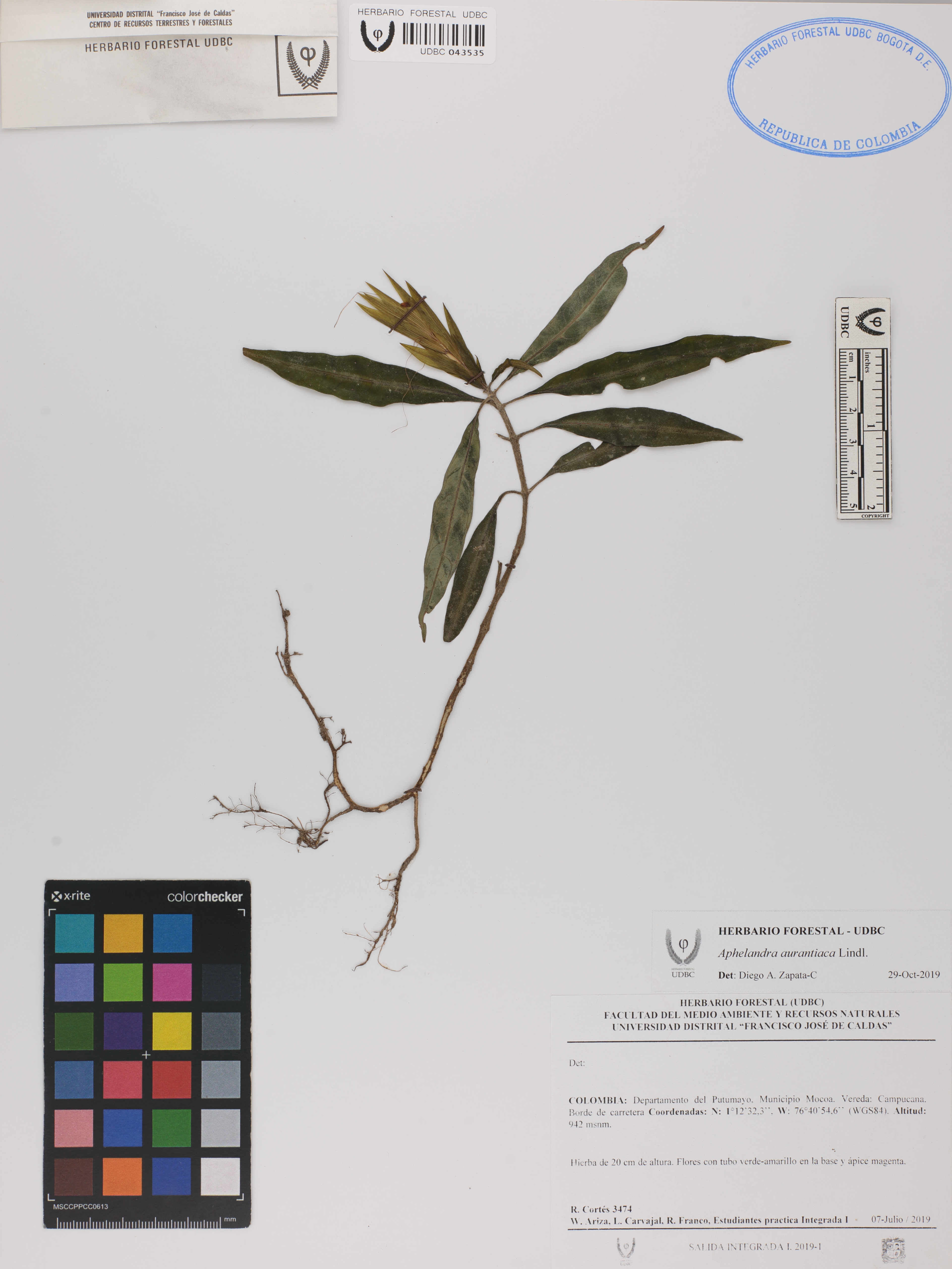 Fotografía del ejemplar Cortés, R. 3474, determinado como Aphelandra aurantiaca en el año 2019