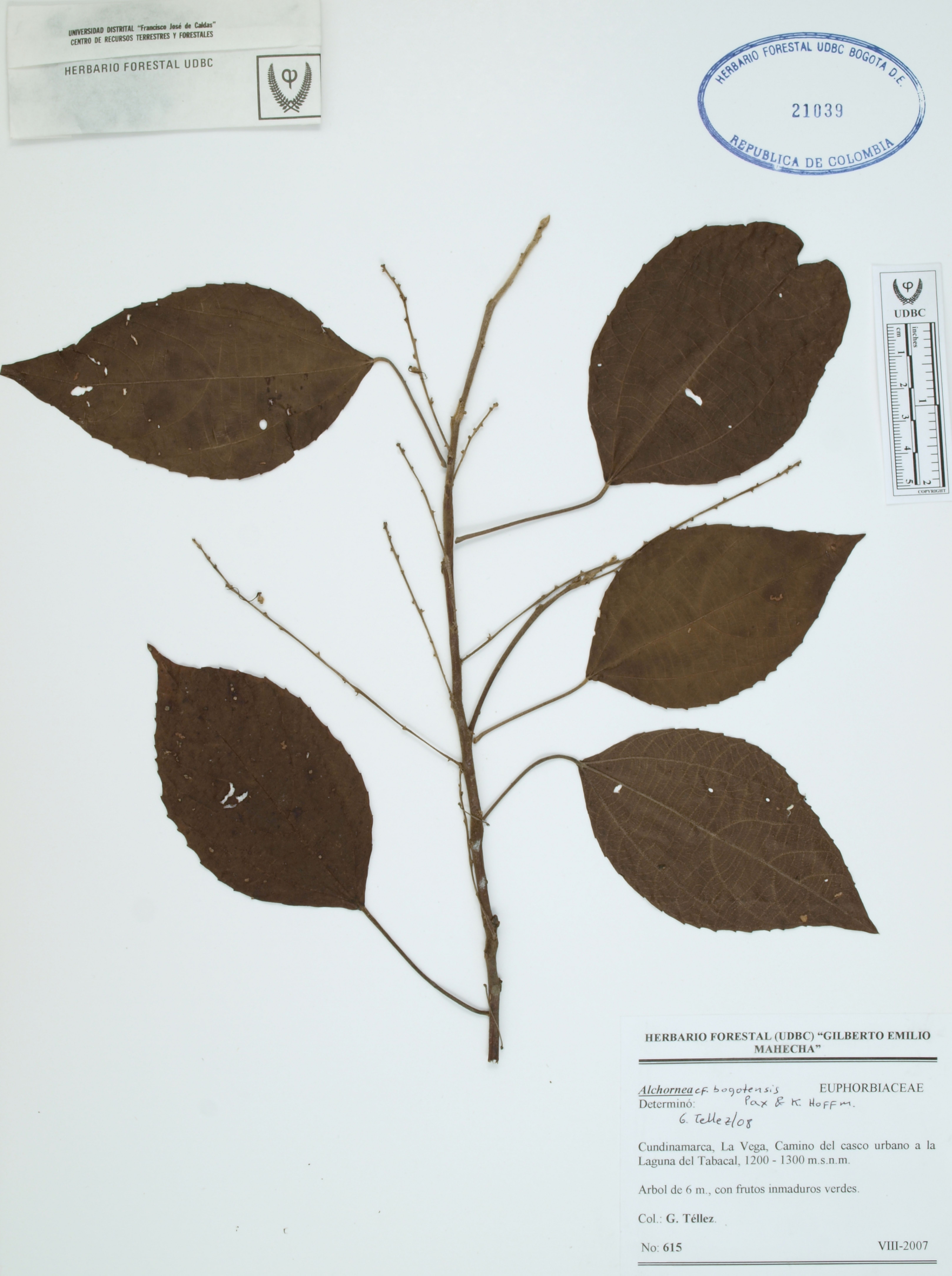 Fotografía del ejemplar Téllez, G. 615, determinado como Alchornea bogotensis en el año 2008