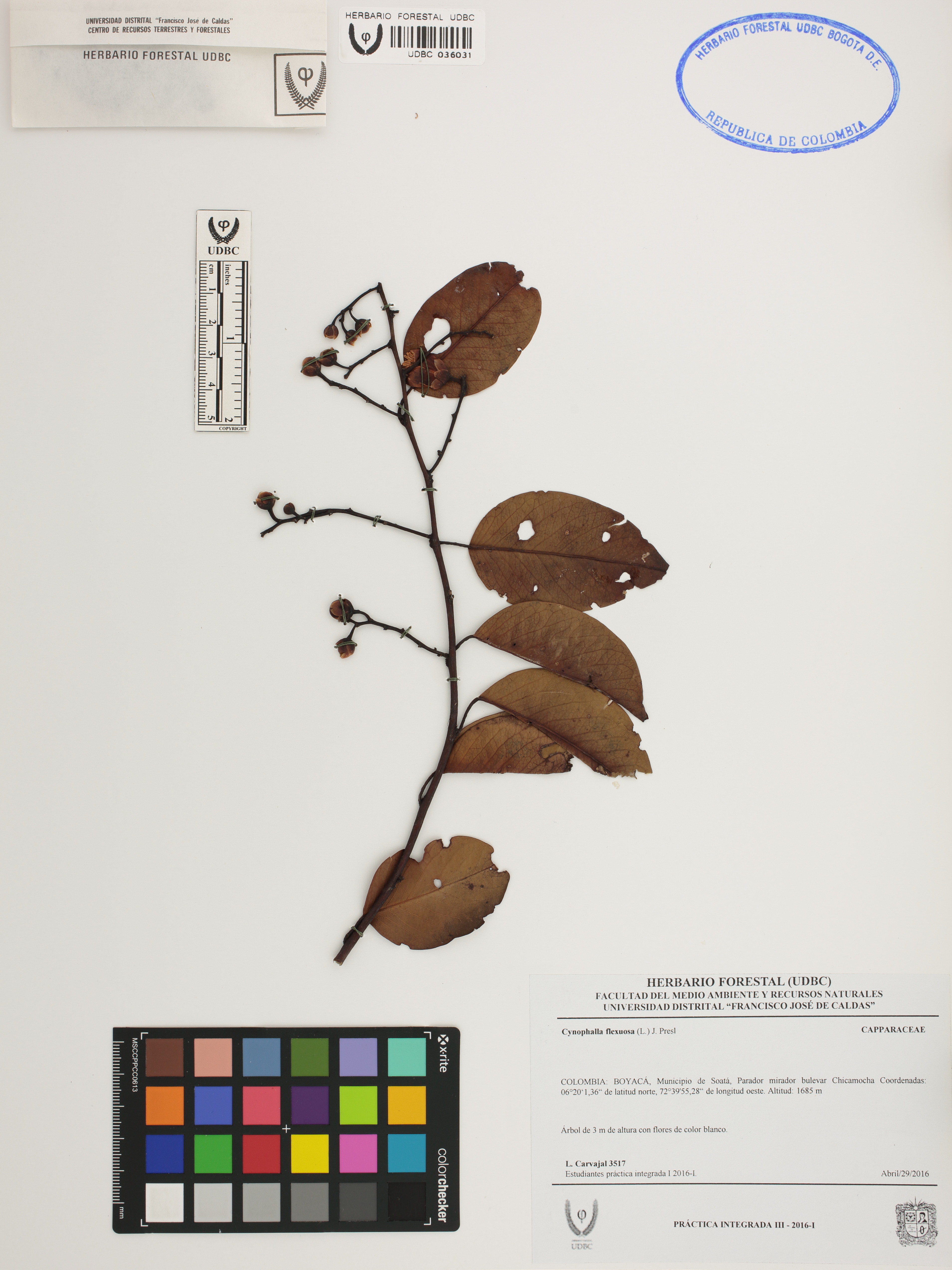 Fotografía del ejemplar Carvajal, L. 3517, determinado como Cynophalla flexuosa