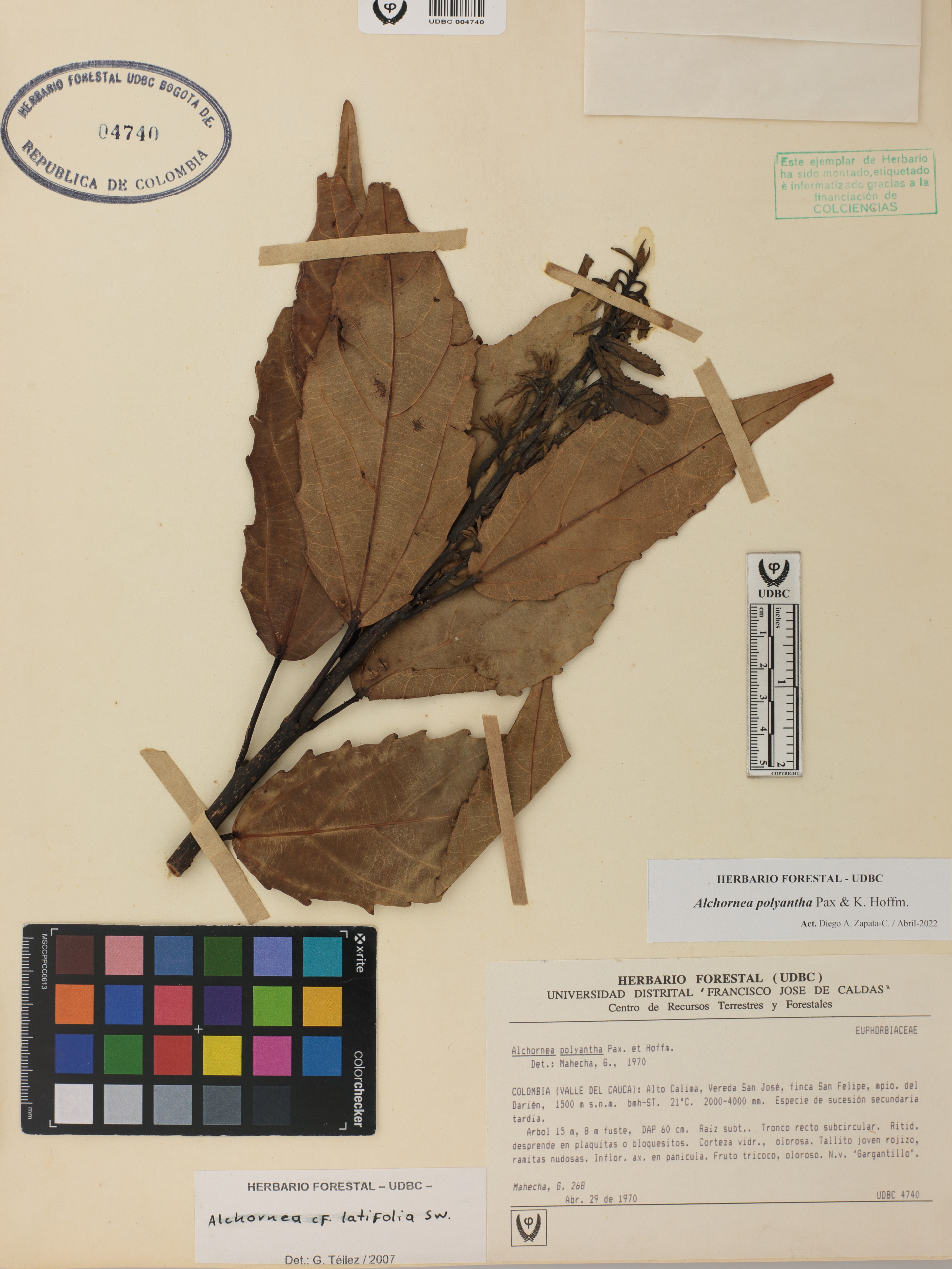 Fotografía del ejemplar Mahecha, G. 268, determinado como Alchornea polyantha en el año 1970