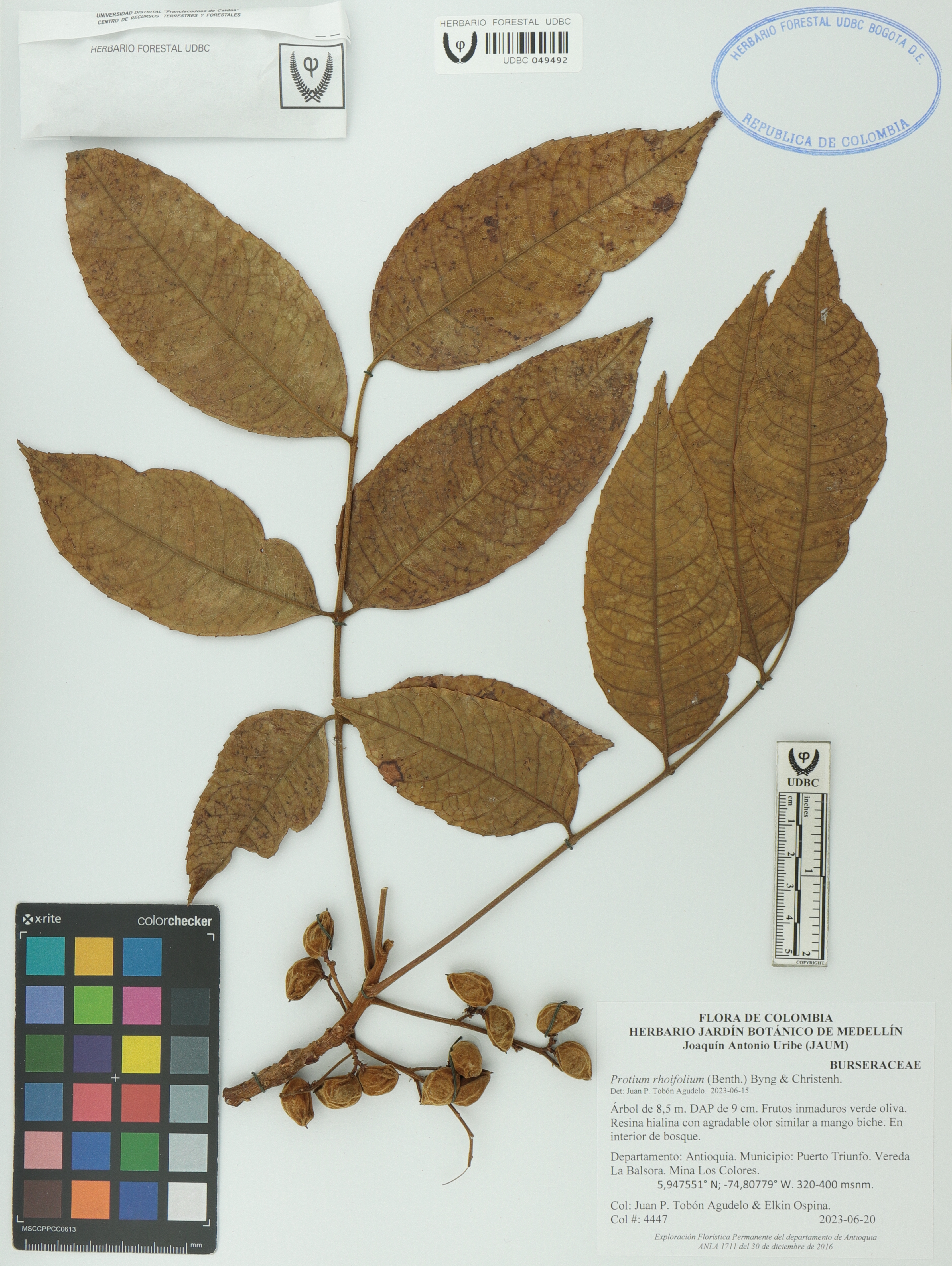 Fotografía del ejemplar Tobón-A., J. 4447, determinado como Protium rhoifolium en el año 2023