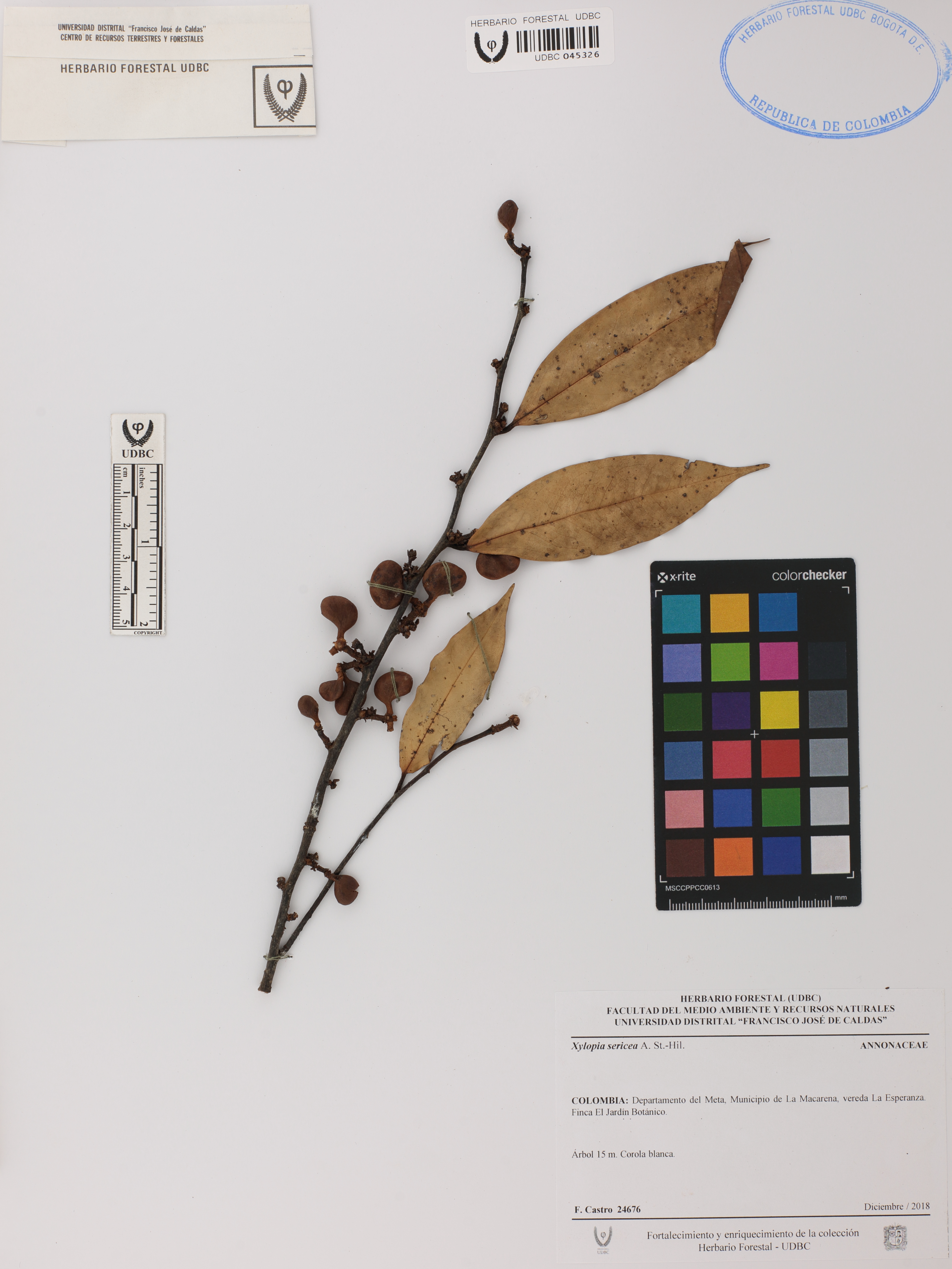 Fotografía del ejemplar Castro, F. 24676, determinado como Xylopia sericea en el año 2018