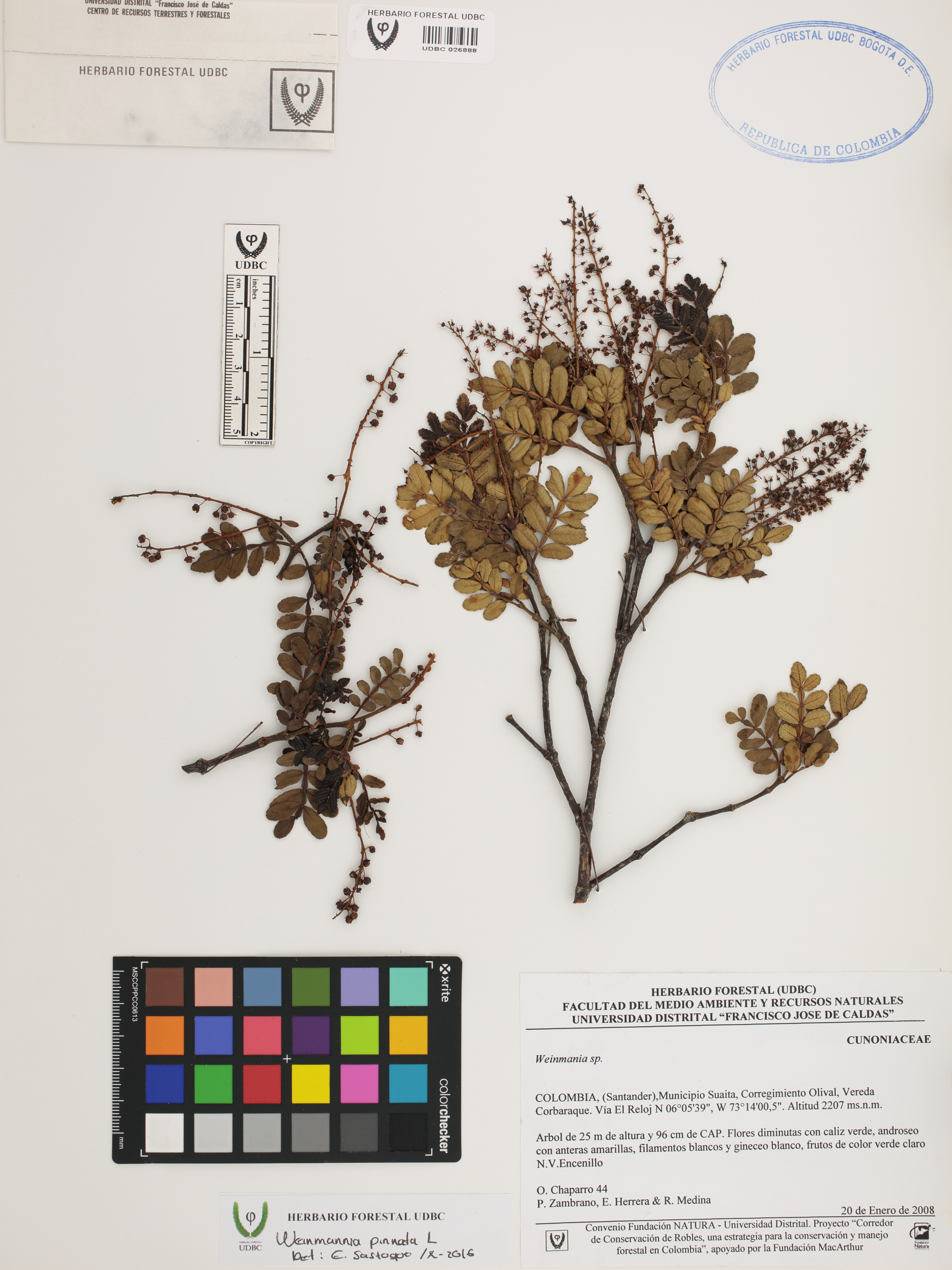 Fotografía del ejemplar Chaparro, O. 44, determinado como Weinmannia pinnata en el año 2016