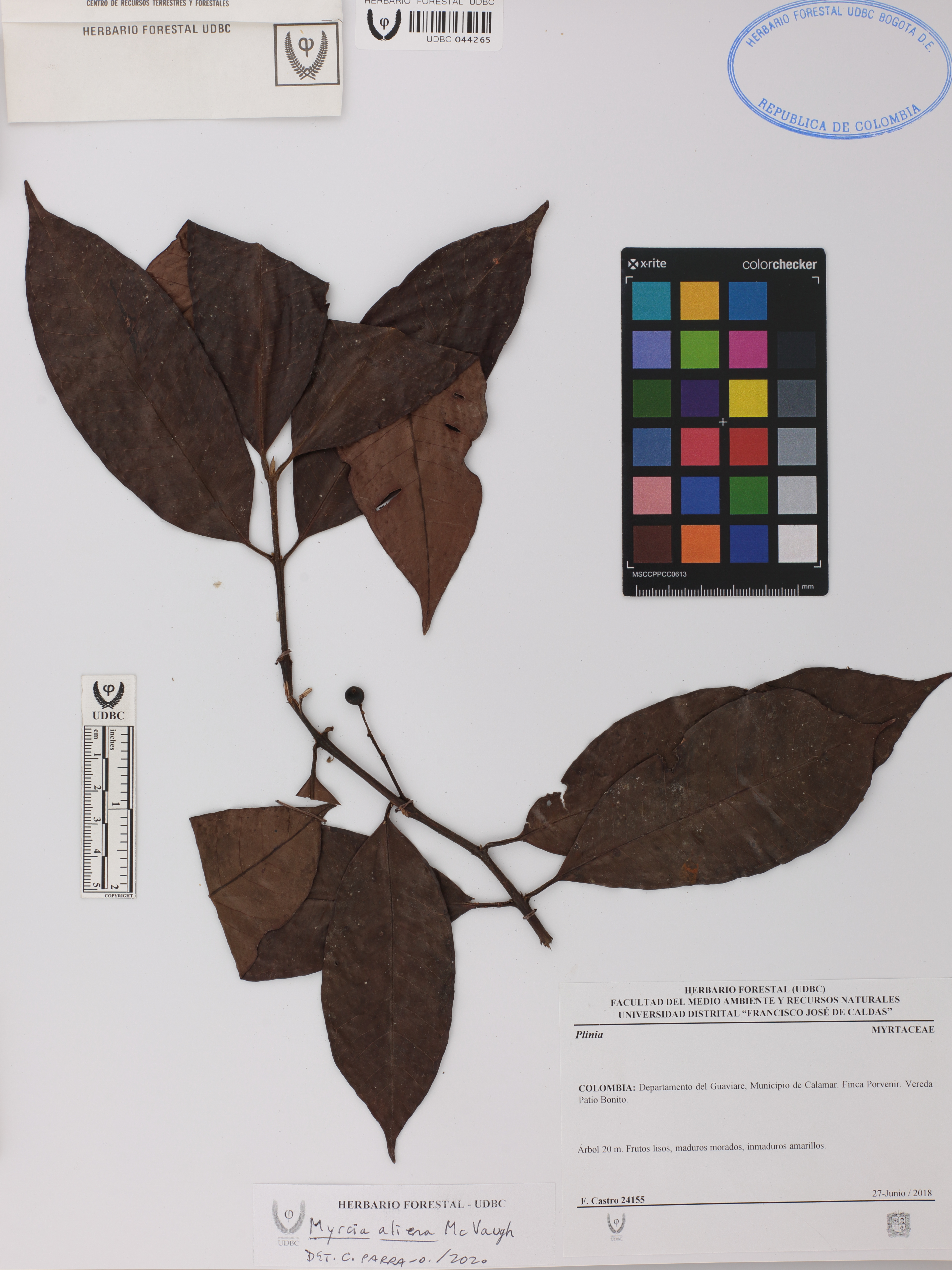 Fotografía del ejemplar Castro, F. 24155, determinado como Myrcia aliena en el año 2020