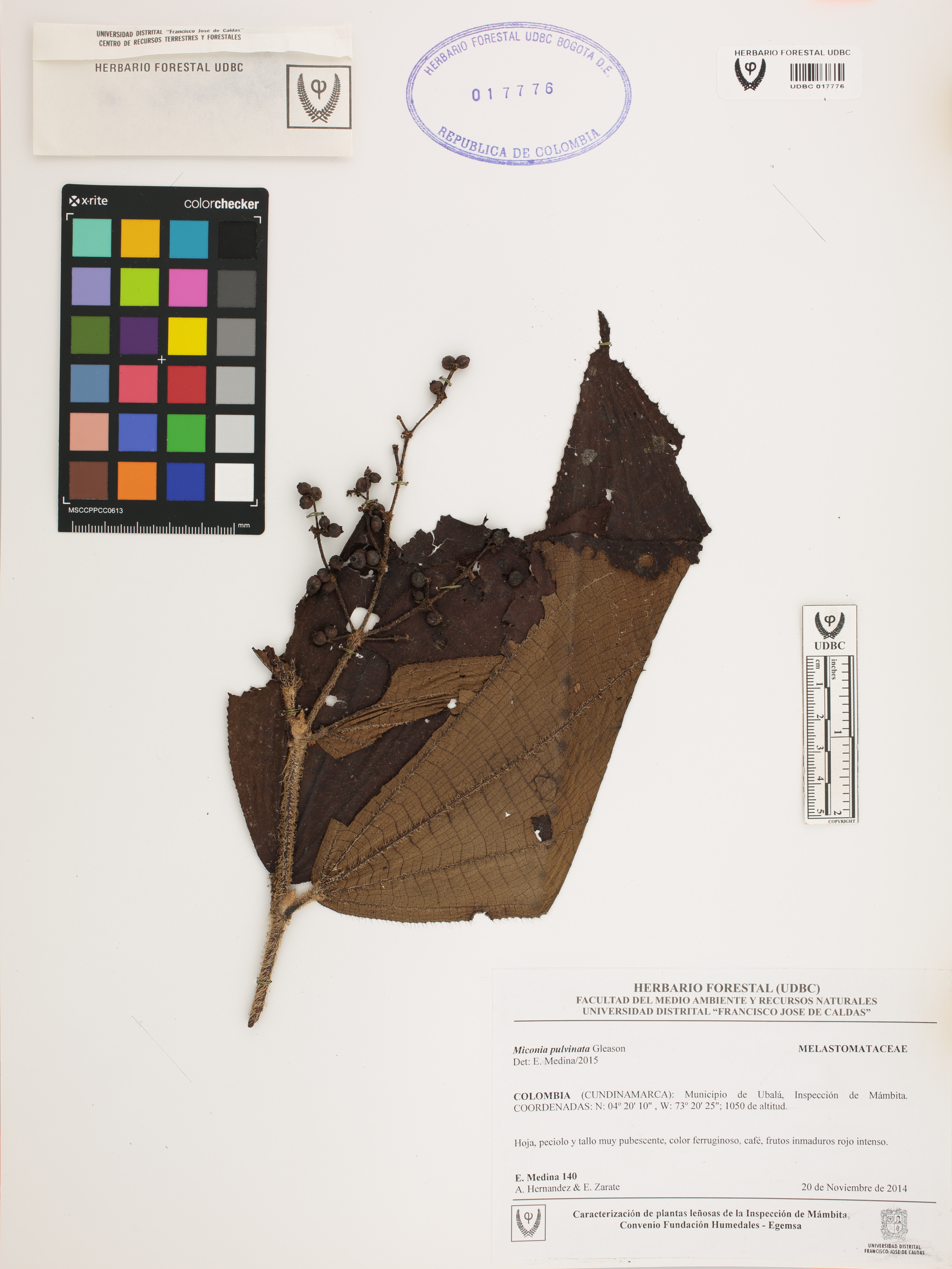 Fotografía del ejemplar Medina, E. 140, determinado como Miconia pulvinata en el año 2015