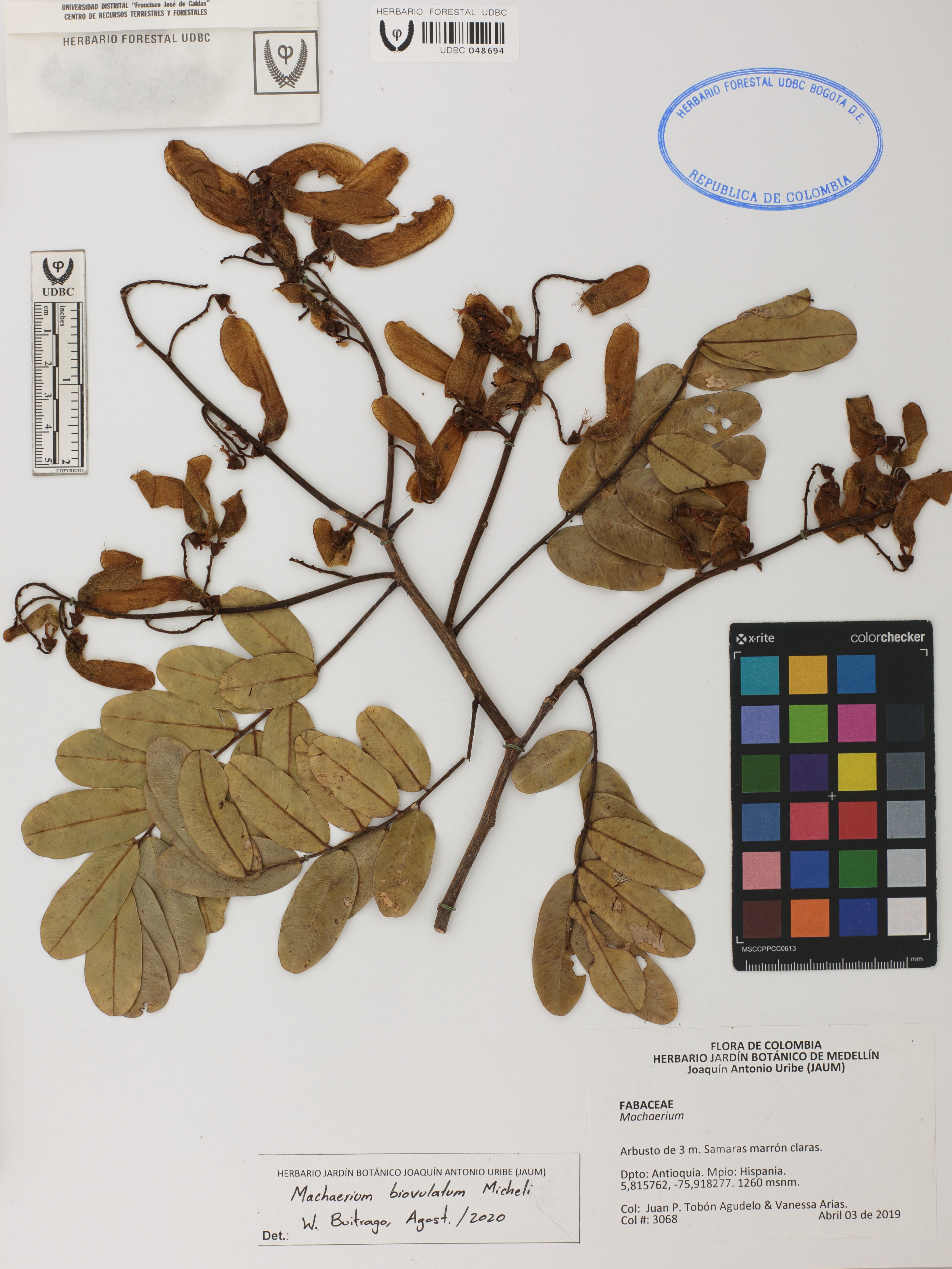Fotografía del ejemplar Tobón-A., J. 3068, determinado como Machaerium biovulatum en el año 2020