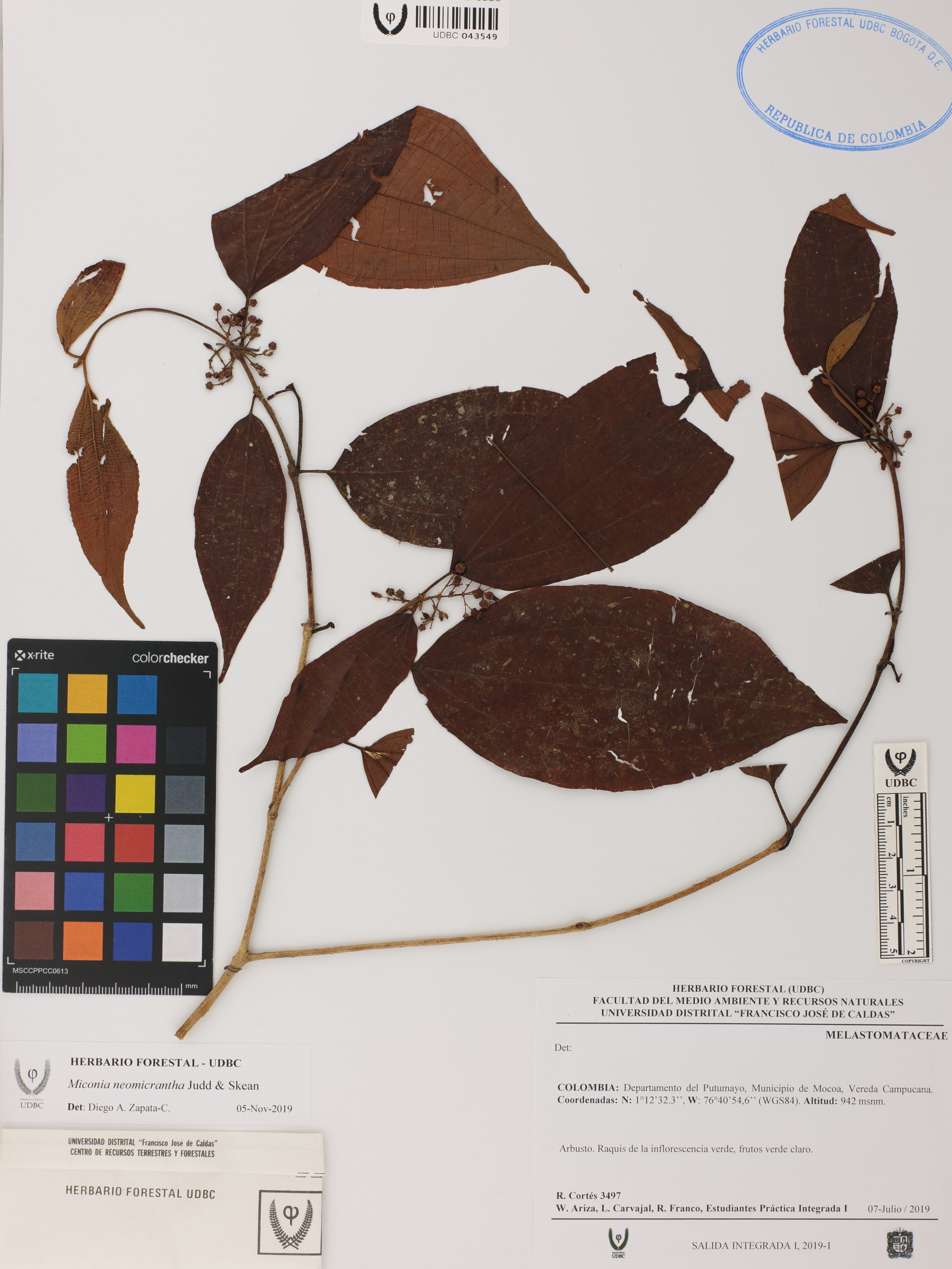 Fotografía del ejemplar Cortés, R. 3497, determinado como Miconia rubescens en el año 2019