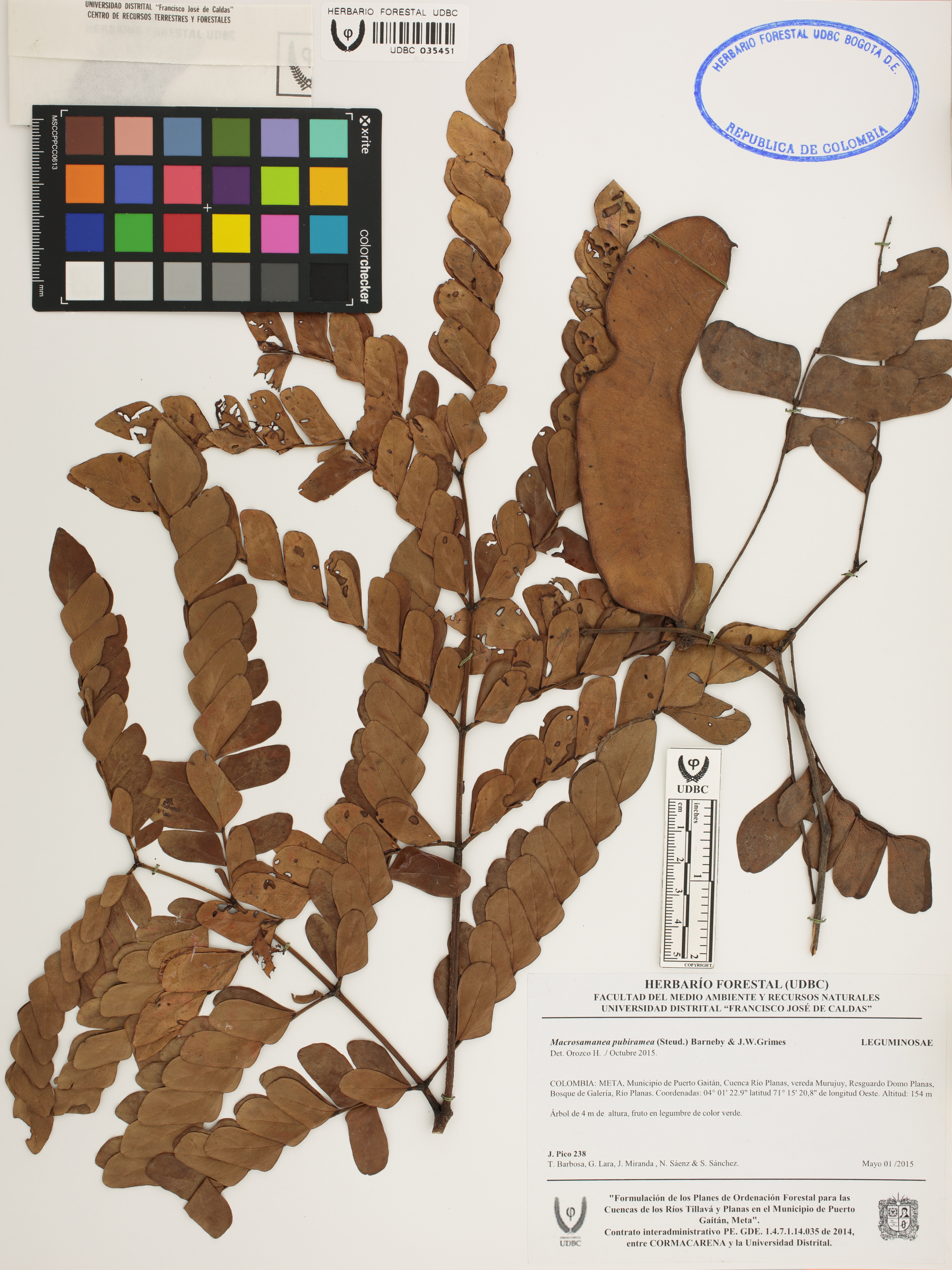 Fotografía del ejemplar Pico, J. 238, determinado como Macrosamanea pubiramea en el año 2015