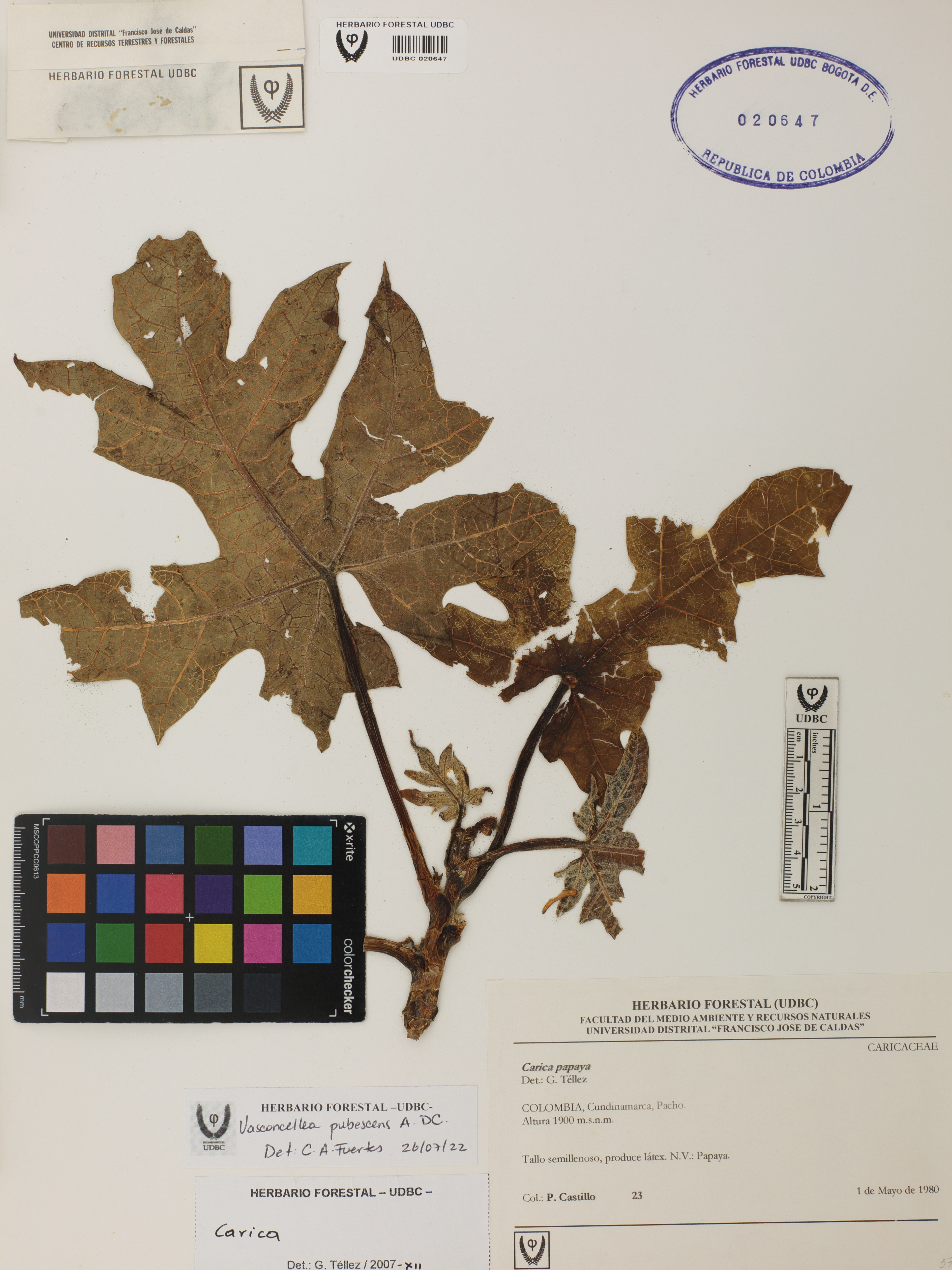Fotografía del ejemplar Castillo, P. 23, determinado como Vasconcellea pubescens en el año 2022
