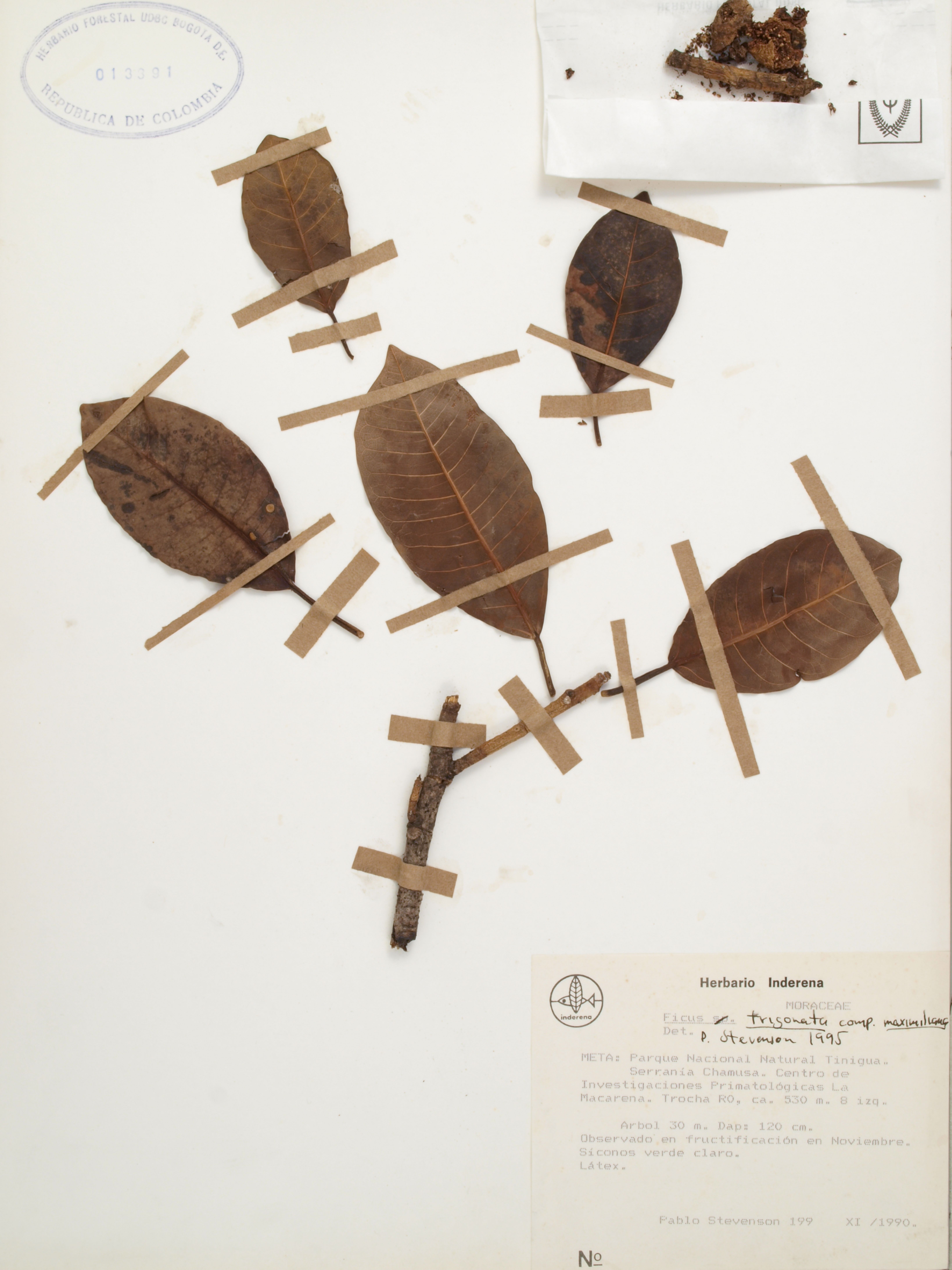 Fotografía del ejemplar Stevenson, P. 199, determinado como Ficus trigona en el año 1995
