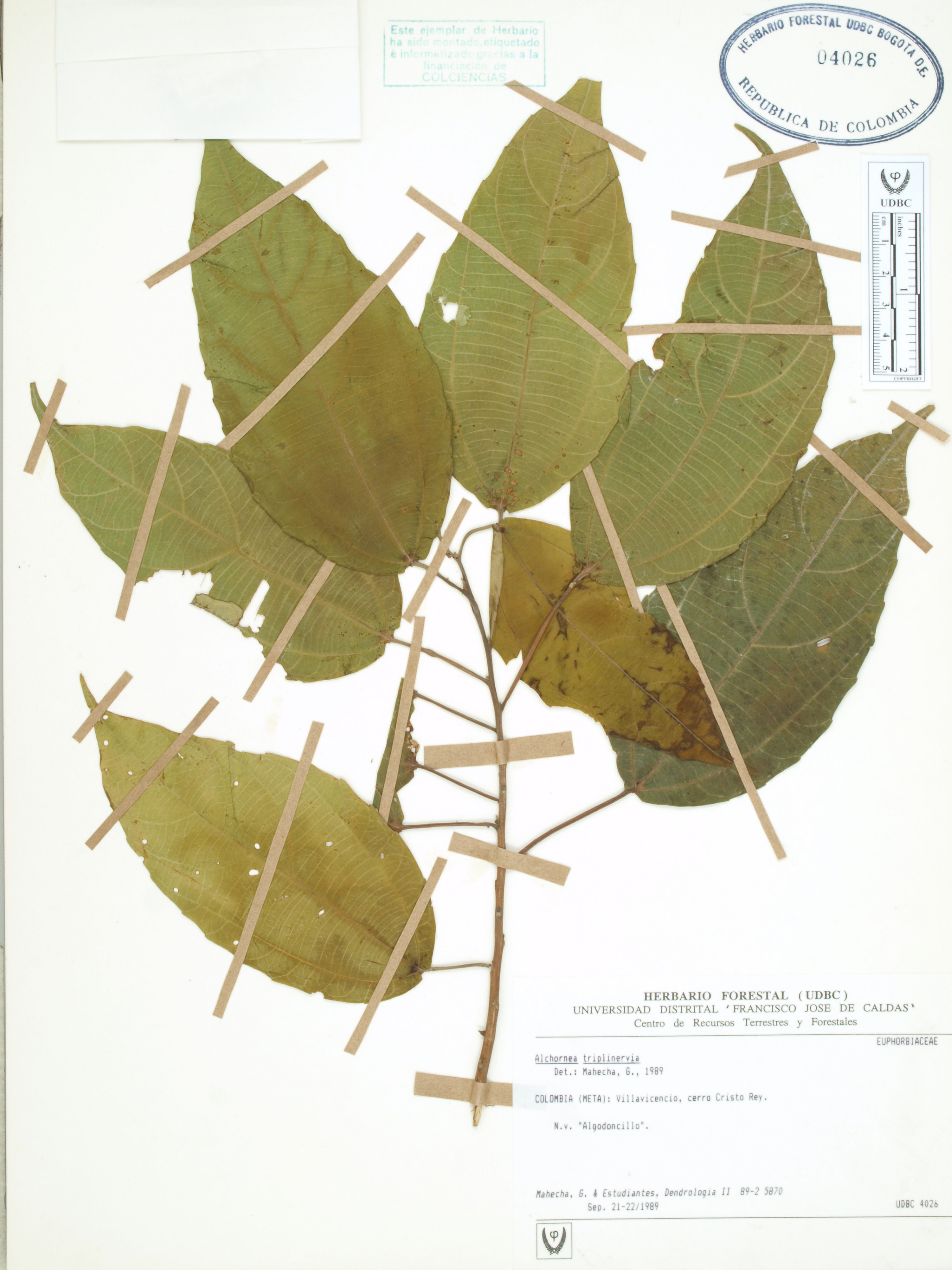 Fotografía del ejemplar Mahecha, G. 5870, determinado como Alchornea triplinervia en el año 1989