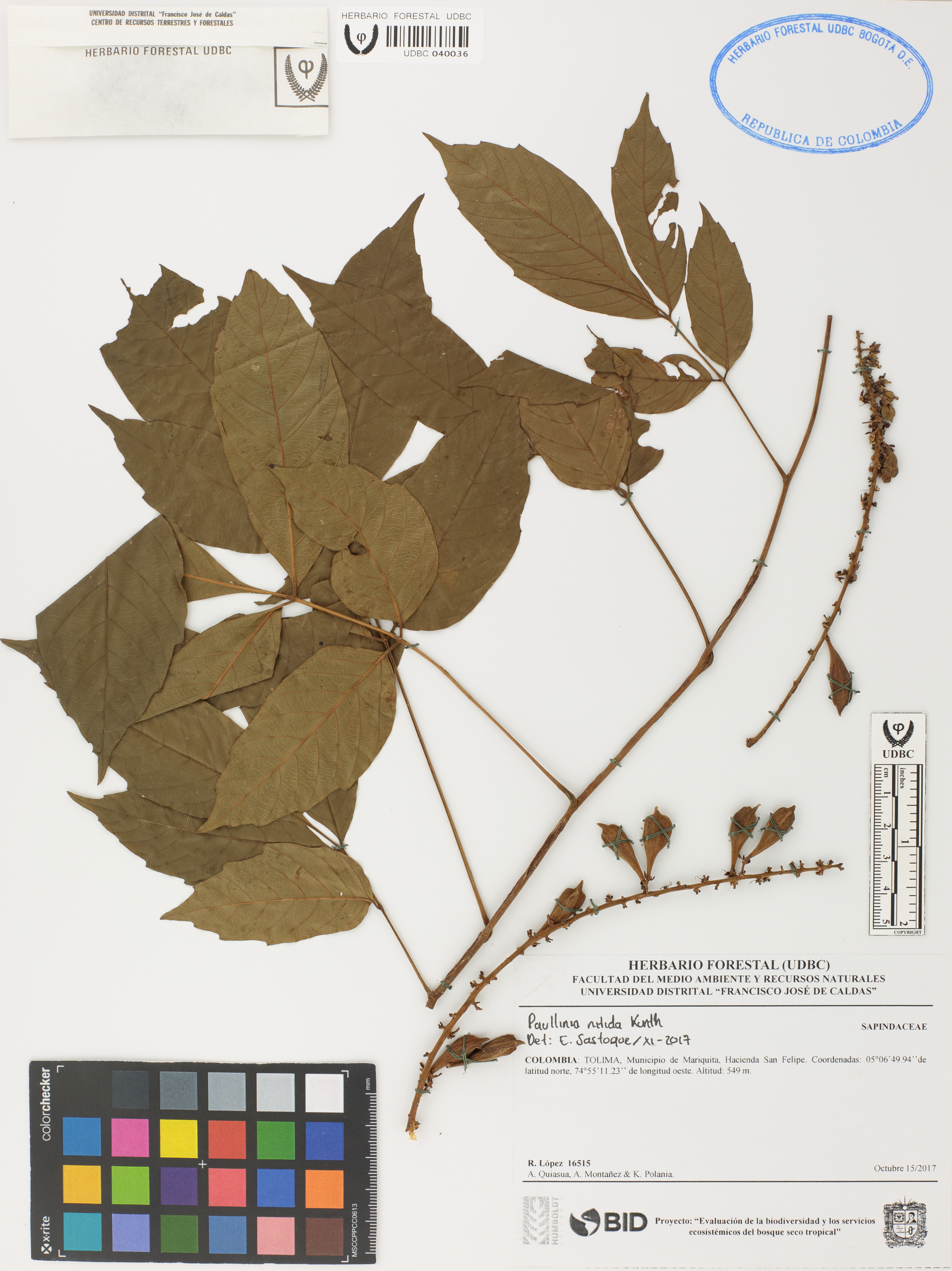 Fotografía del ejemplar López, R. 16515, determinado como Paullinia nitida en el año 2017