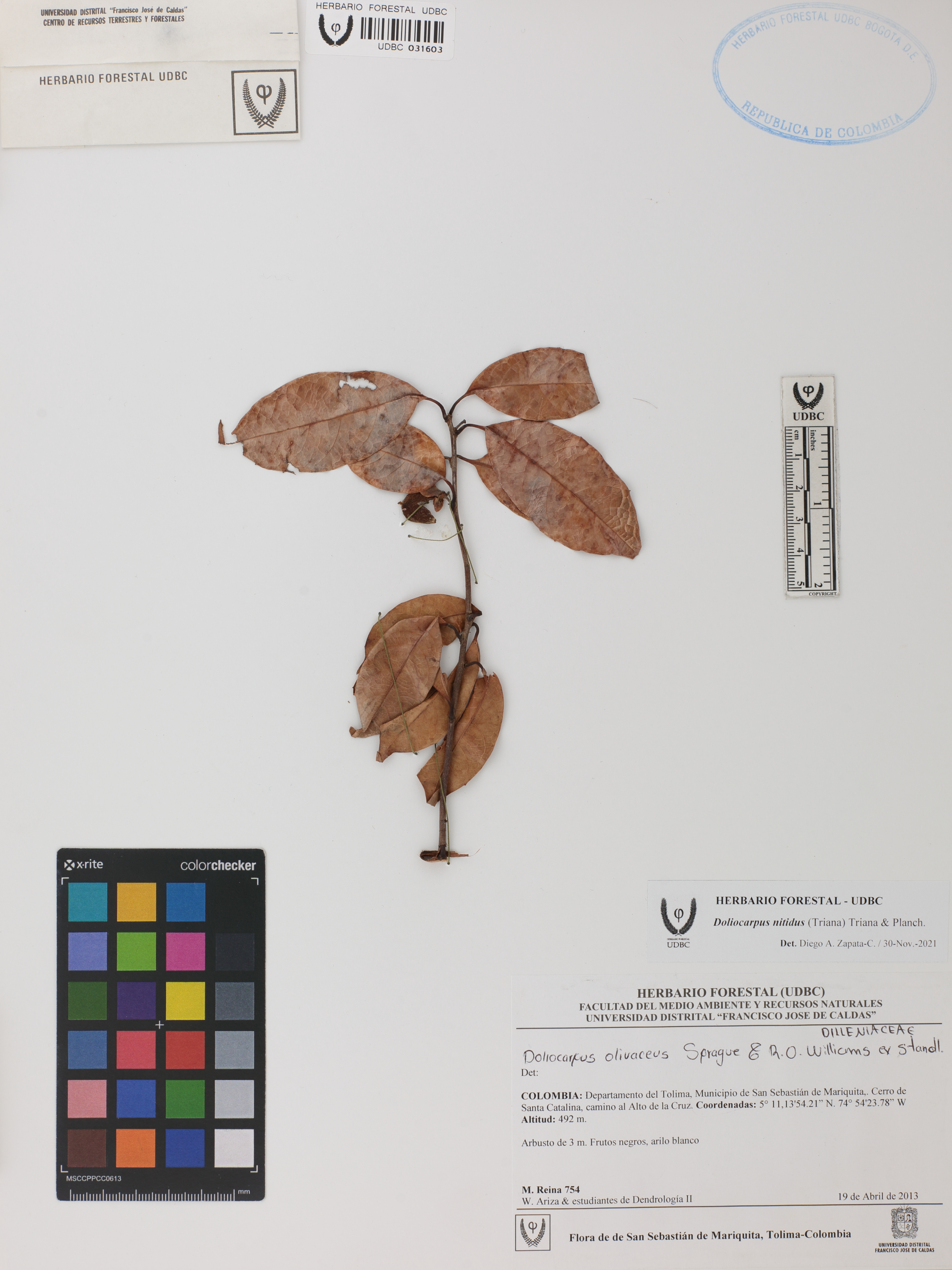 Fotografía del ejemplar Reina, M. 754, determinado como Doliocarpus nitidus en el año 2021
