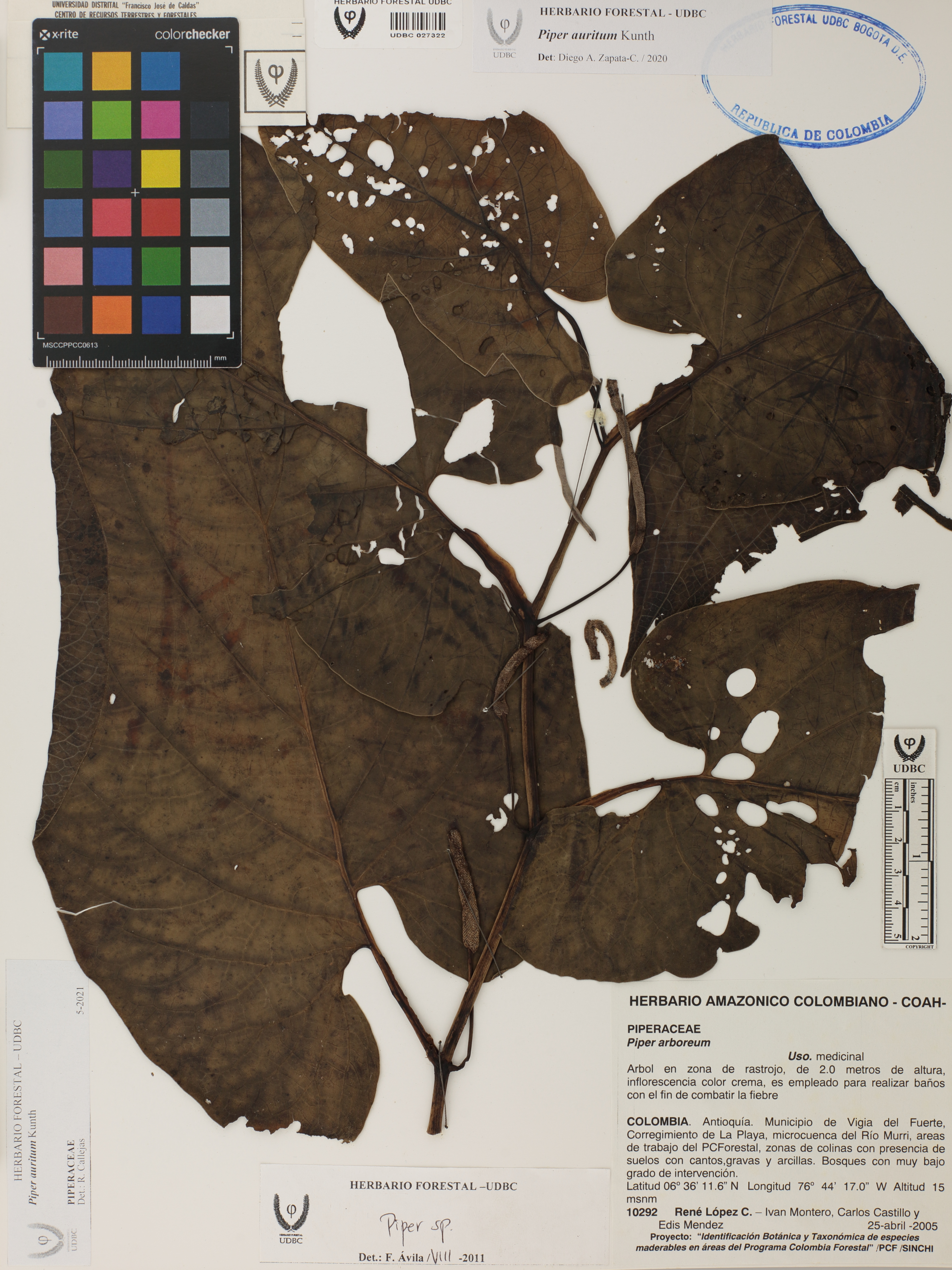 Fotografía del ejemplar López, R. 10292, determinado como Piper auritum en el año 2021