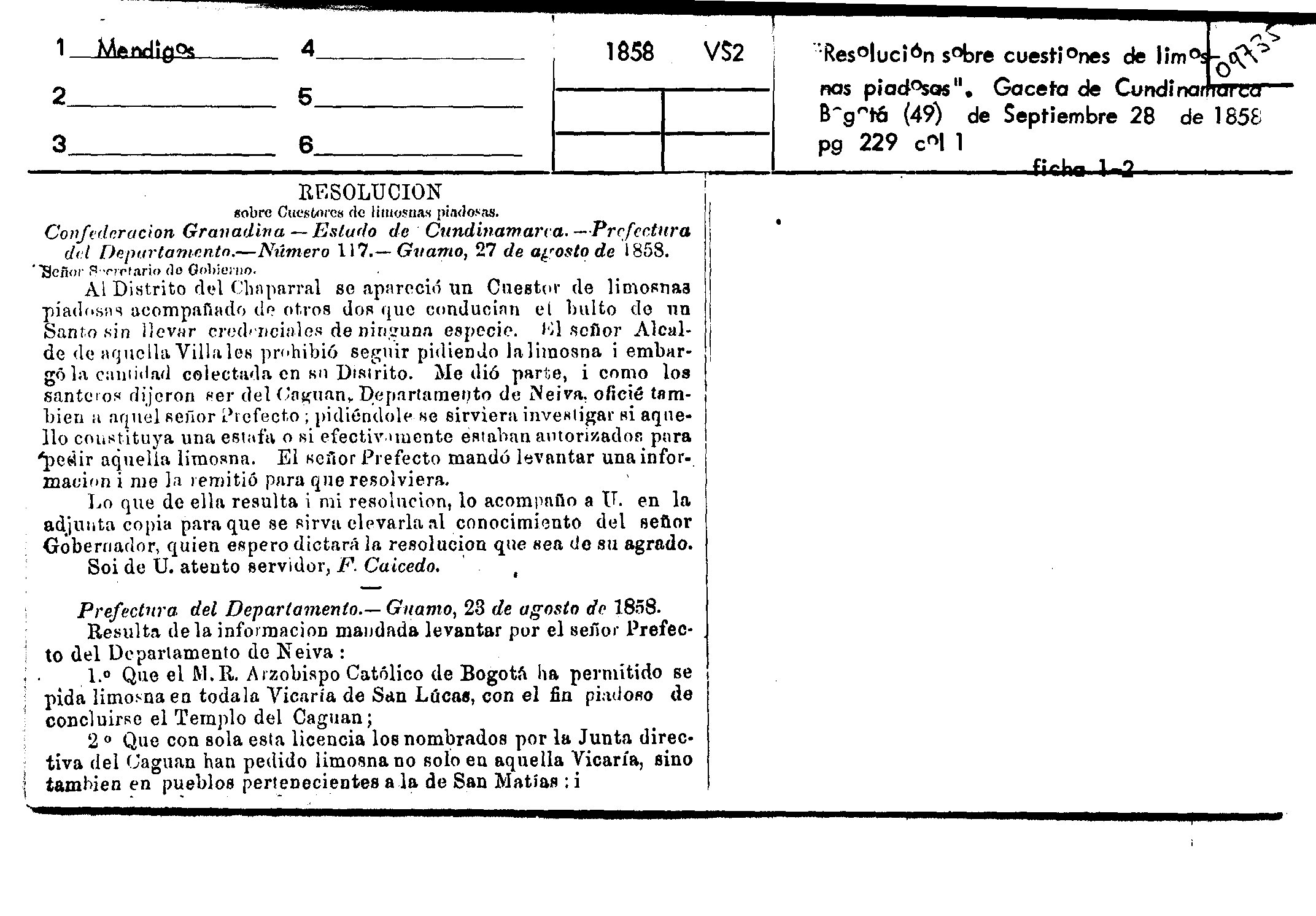 The image contains a news item about the Resolution on pious alms issues in which the Grenadian Confederation, the Statute of Cundinamarca and the Prefecture of the Department stipulate to the District of Chaparral the appearance of a Quaestor of pious alms accompanied by two other people who were carrying a bundle of a Saint without carrying credentials of any kind, Therefore, the Governor of this area prohibited to continue asking for alms and what had been collected will be seized in collection by the District, for such fact the Prefect requests to make a report for knowledge and for resolution purposes of this event. In addition to this event, Mr. M.R. Catholic Archbishop of Bogota mentioned that begging will be allowed in all the Vicariate of San Lucas, with the pious purpose of concluding the Temple of Caguan. Finally it is defined that the Executive Power approves in all its parts the resolution of the Prefect of Guamo, on the requirements that are necessary to exercise the office of alms collector and it is disposed that said resolution be disposed in all the Departments of the State.