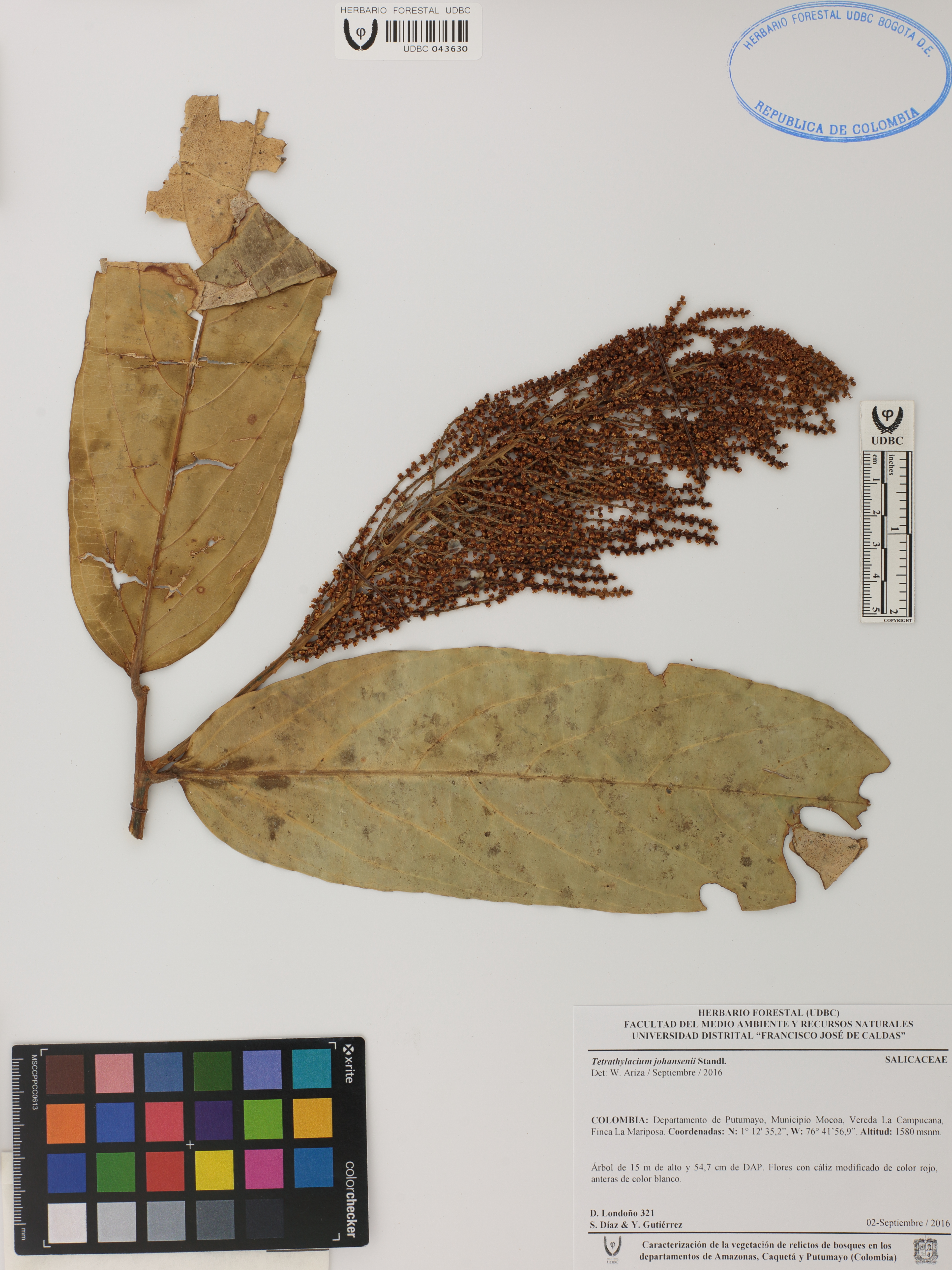 Fotografía del ejemplar Londoño, D. 321, determinado como Tetrathylacium johansenii en el año 2016