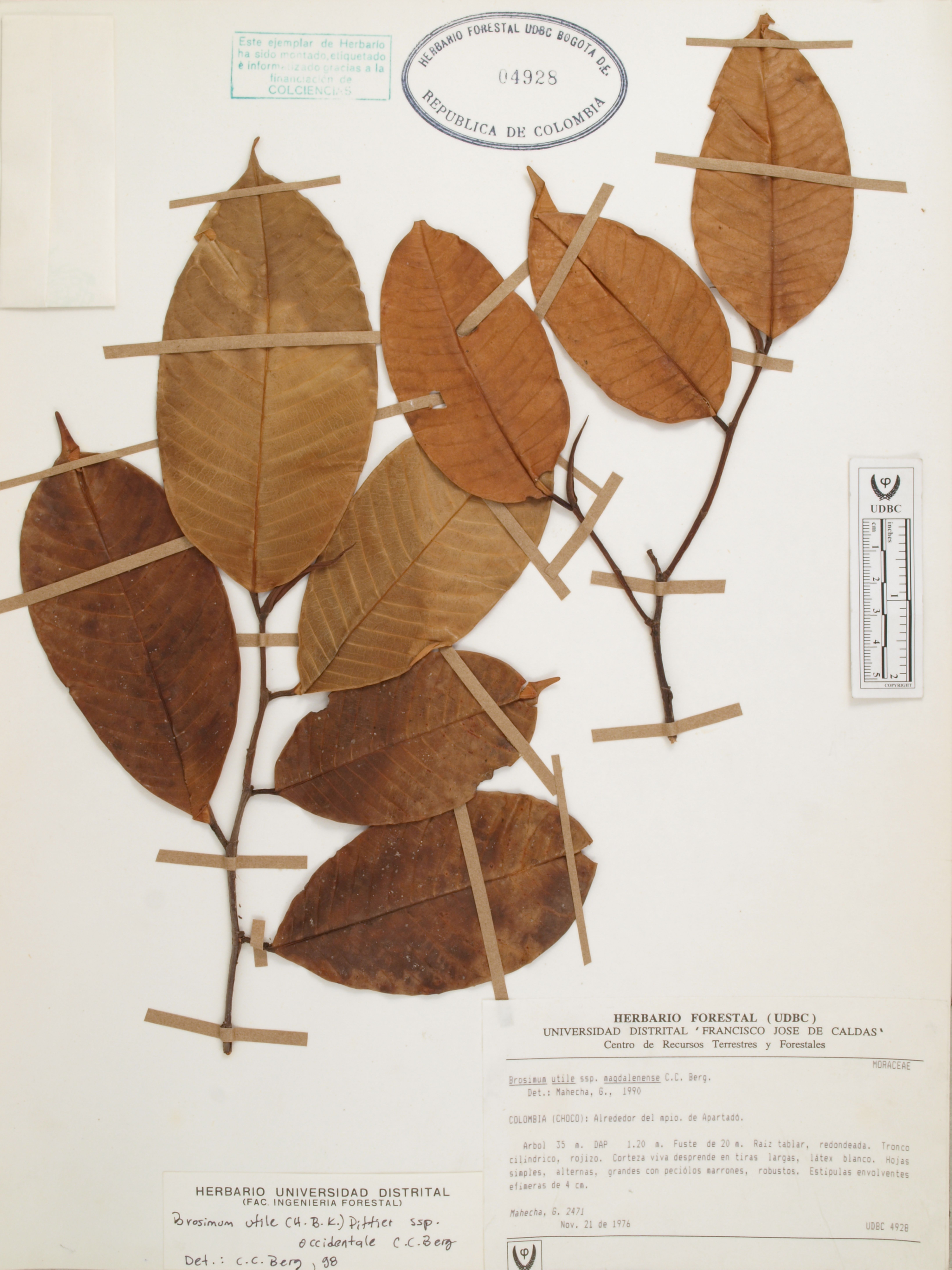 Fotografía del ejemplar Mahecha, G. 2471, determinado como Brosimum utile subsp. occidentale en el año 1998