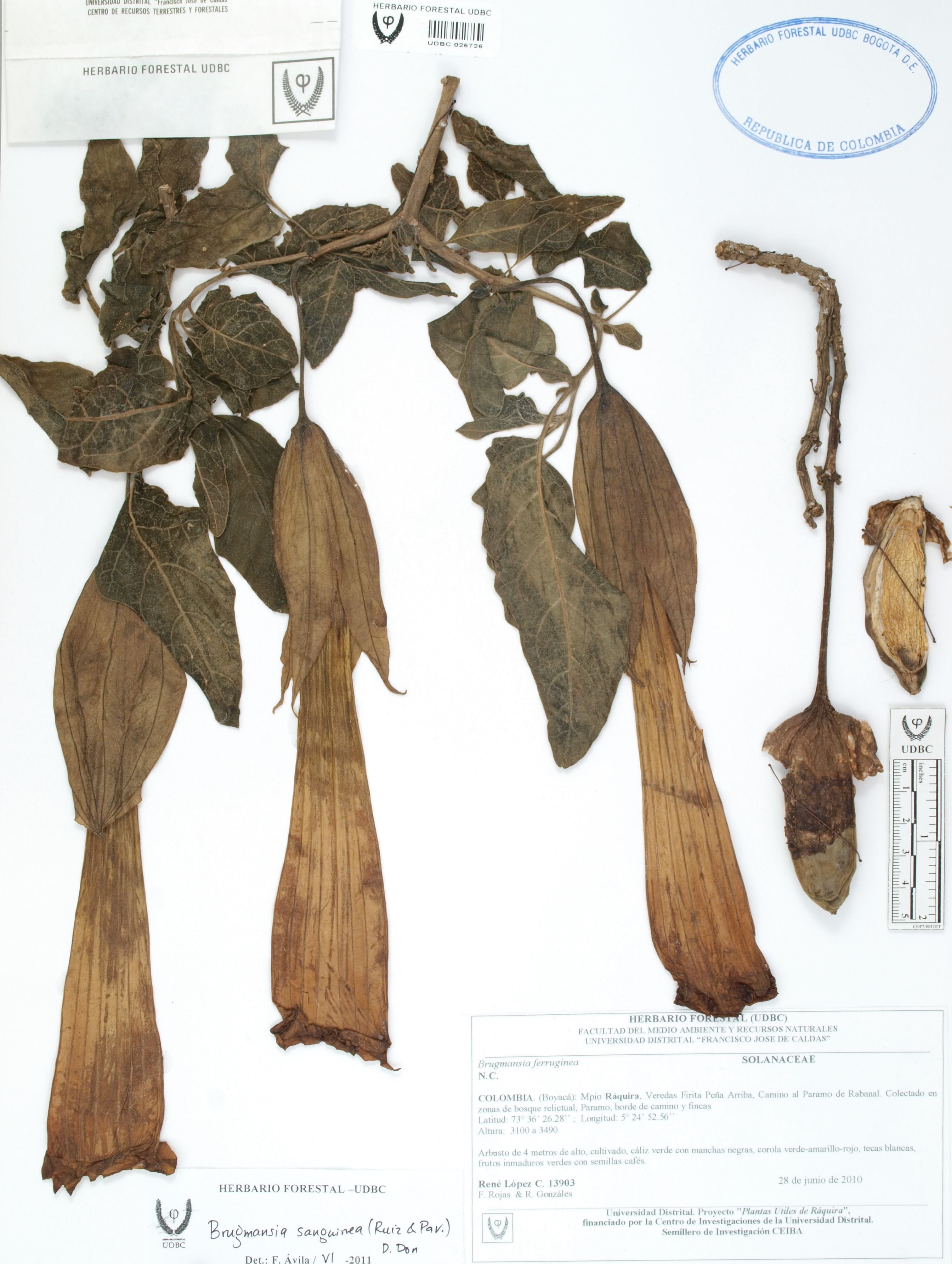 Fotografía del ejemplar López, R. 13903, determinado como Brugmansia sanguinea en el año 2011