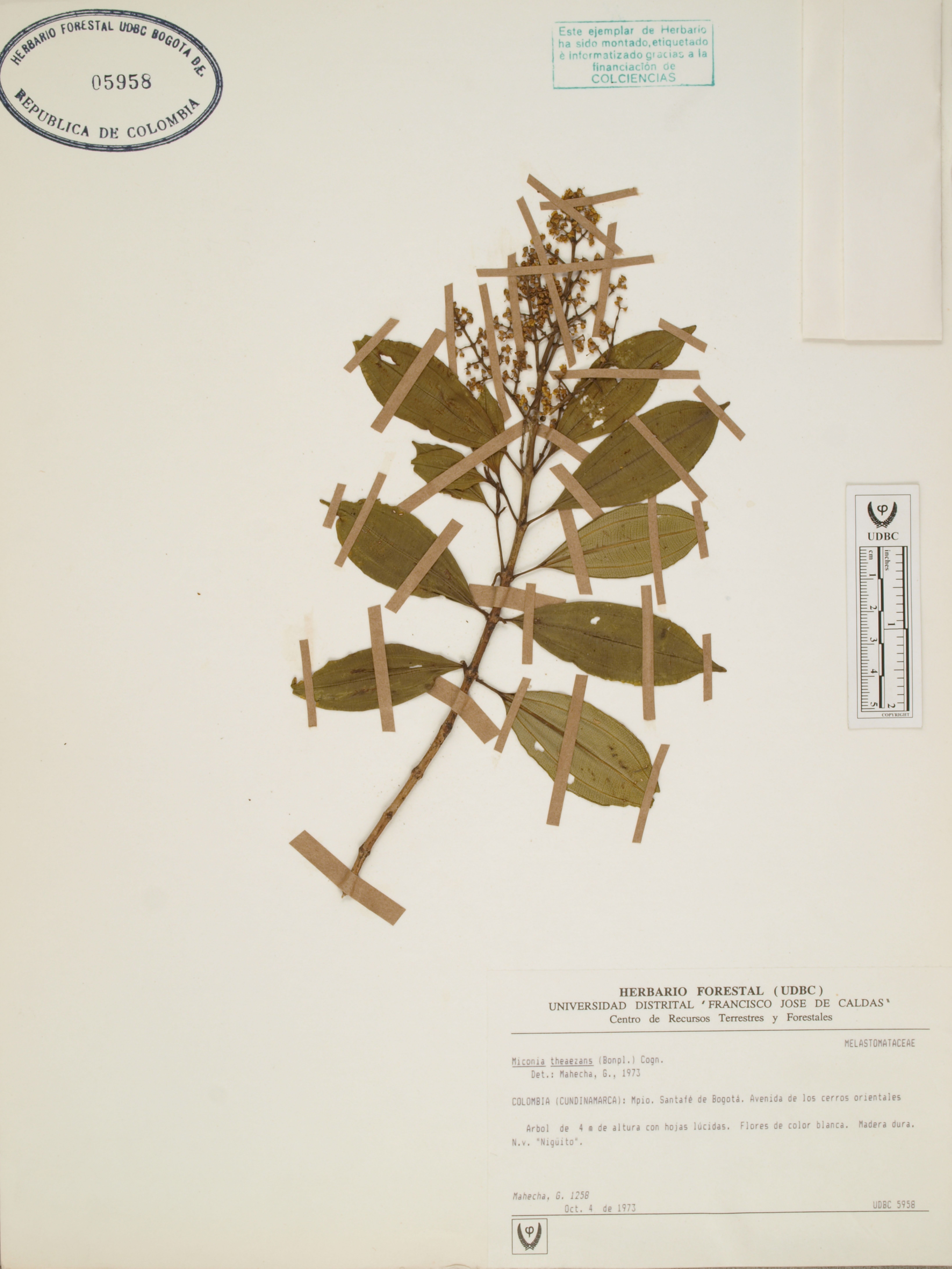 Fotografía del ejemplar Mahecha, G. 1258, determinado como Miconia theaezans en el año 1973