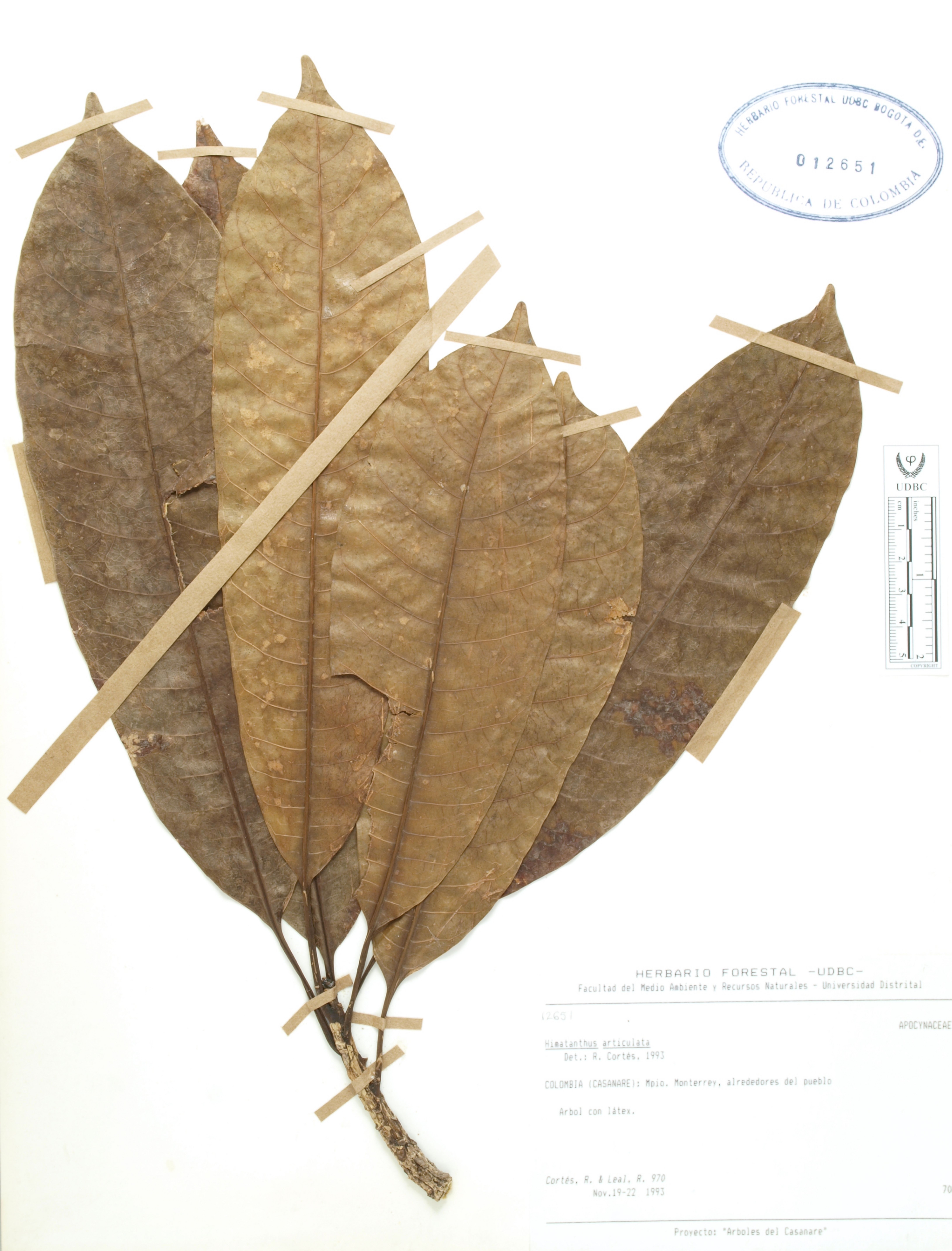 Fotografía del ejemplar Cortés-B., R. 970, determinado como Himatanthus articulatus en el año 1993