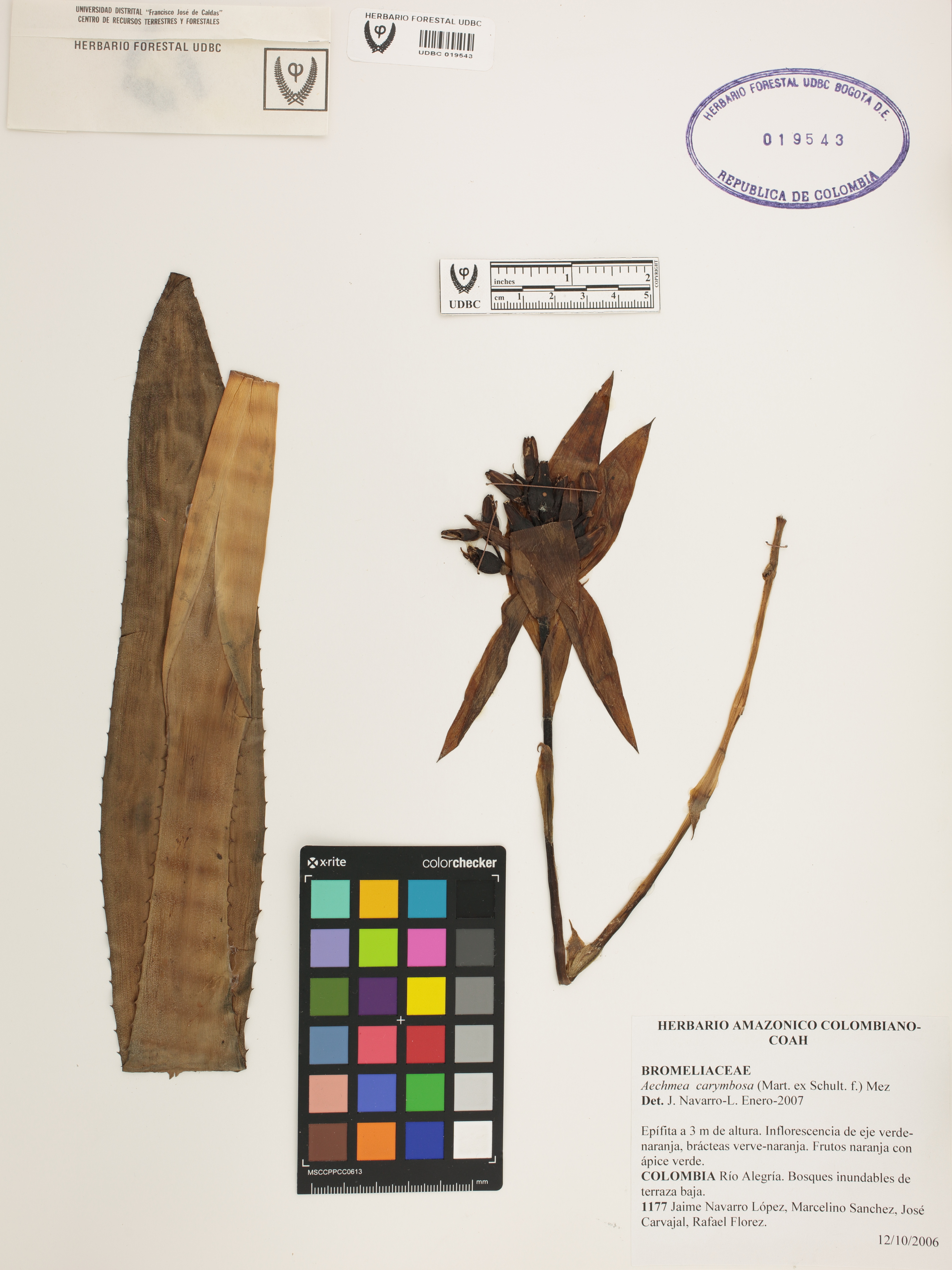 Fotografía del ejemplar Navarro, J. 1177, determinado como Aechmea corymbosa en el año 2007