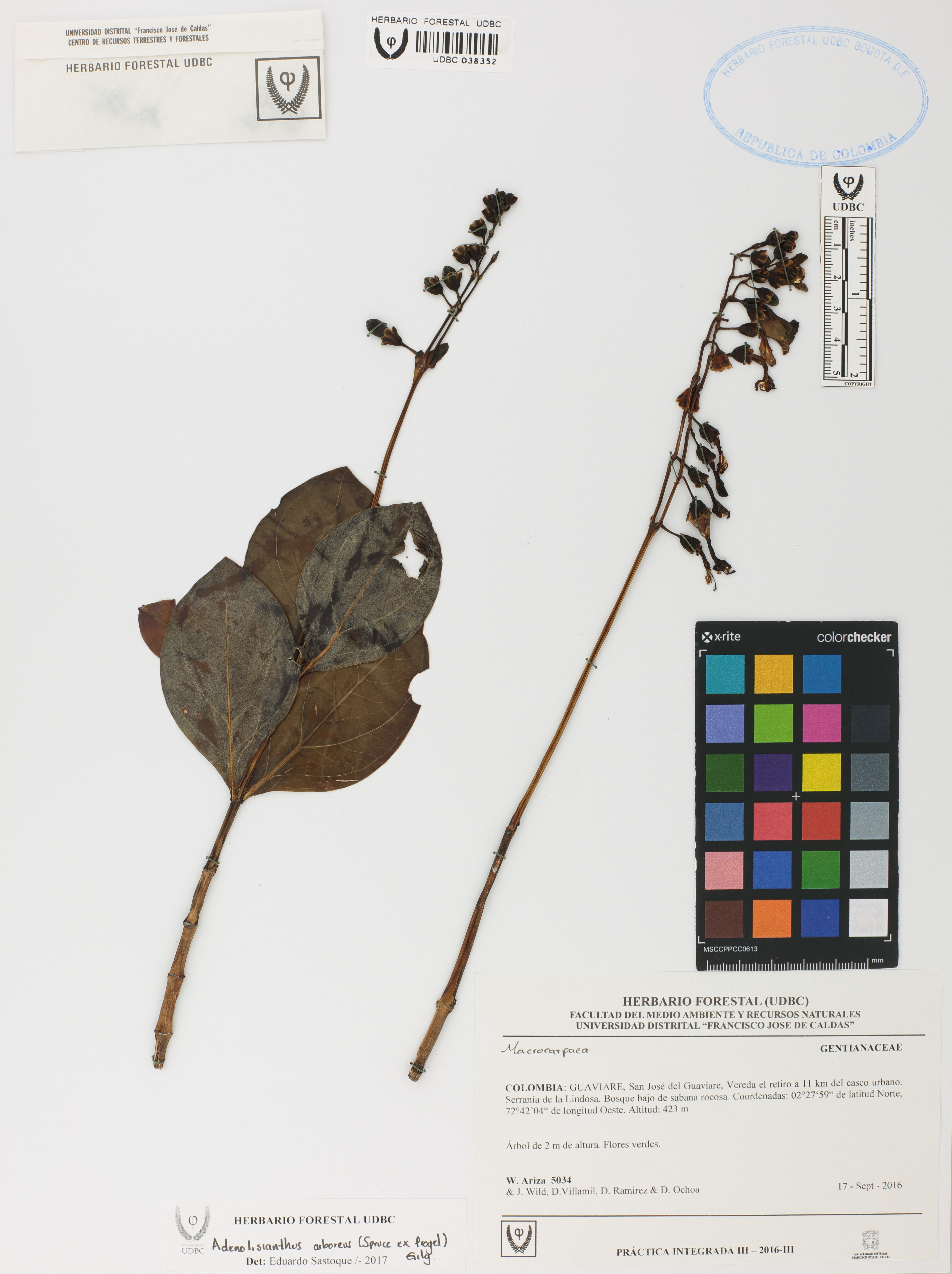 Fotografía del ejemplar Ariza, W. 5034, determinado como Adenolisianthus arboreus en el año 2017