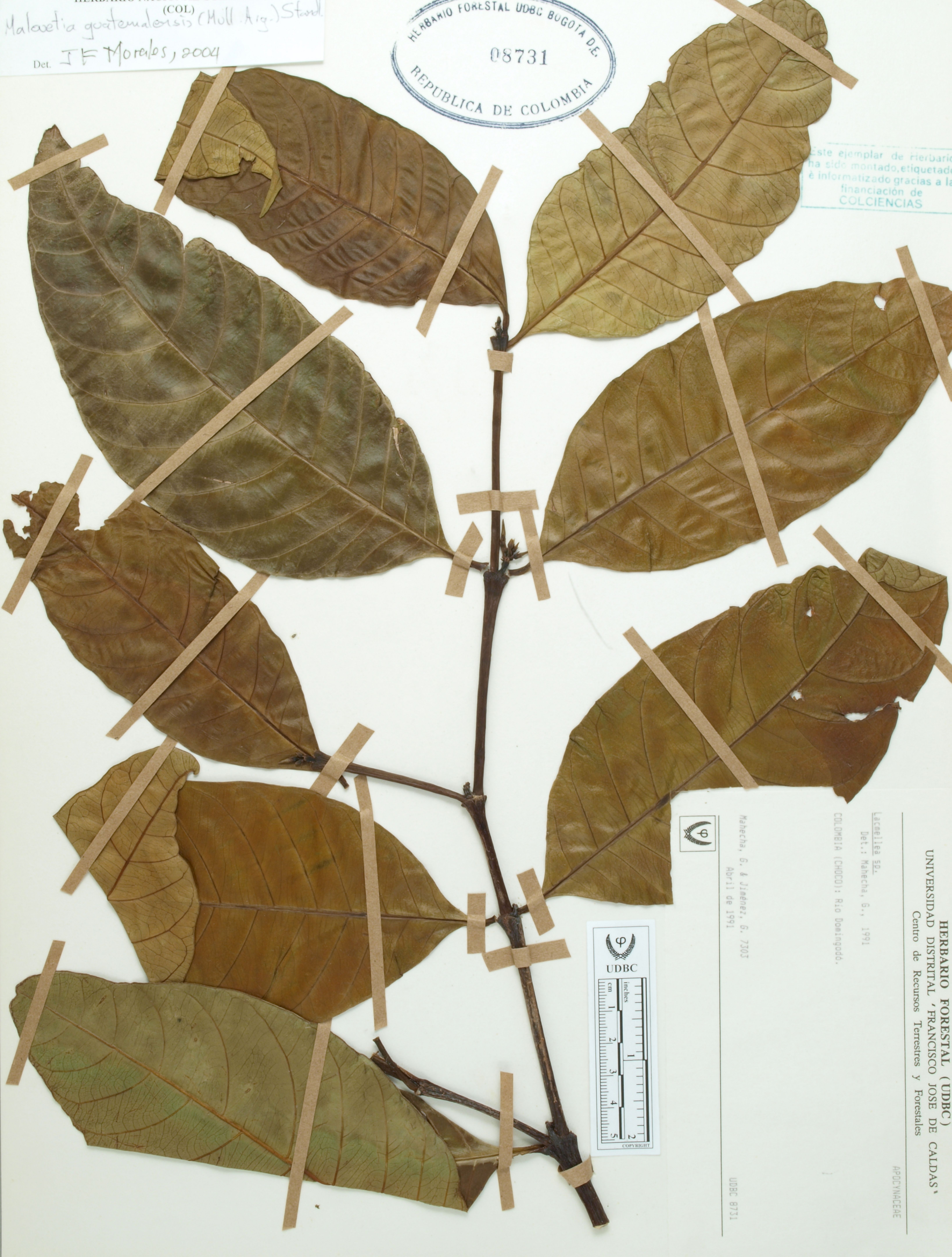 Fotografía del ejemplar Mahecha, G. 7304, determinado como Malouetia guatemalensis en el año 2004