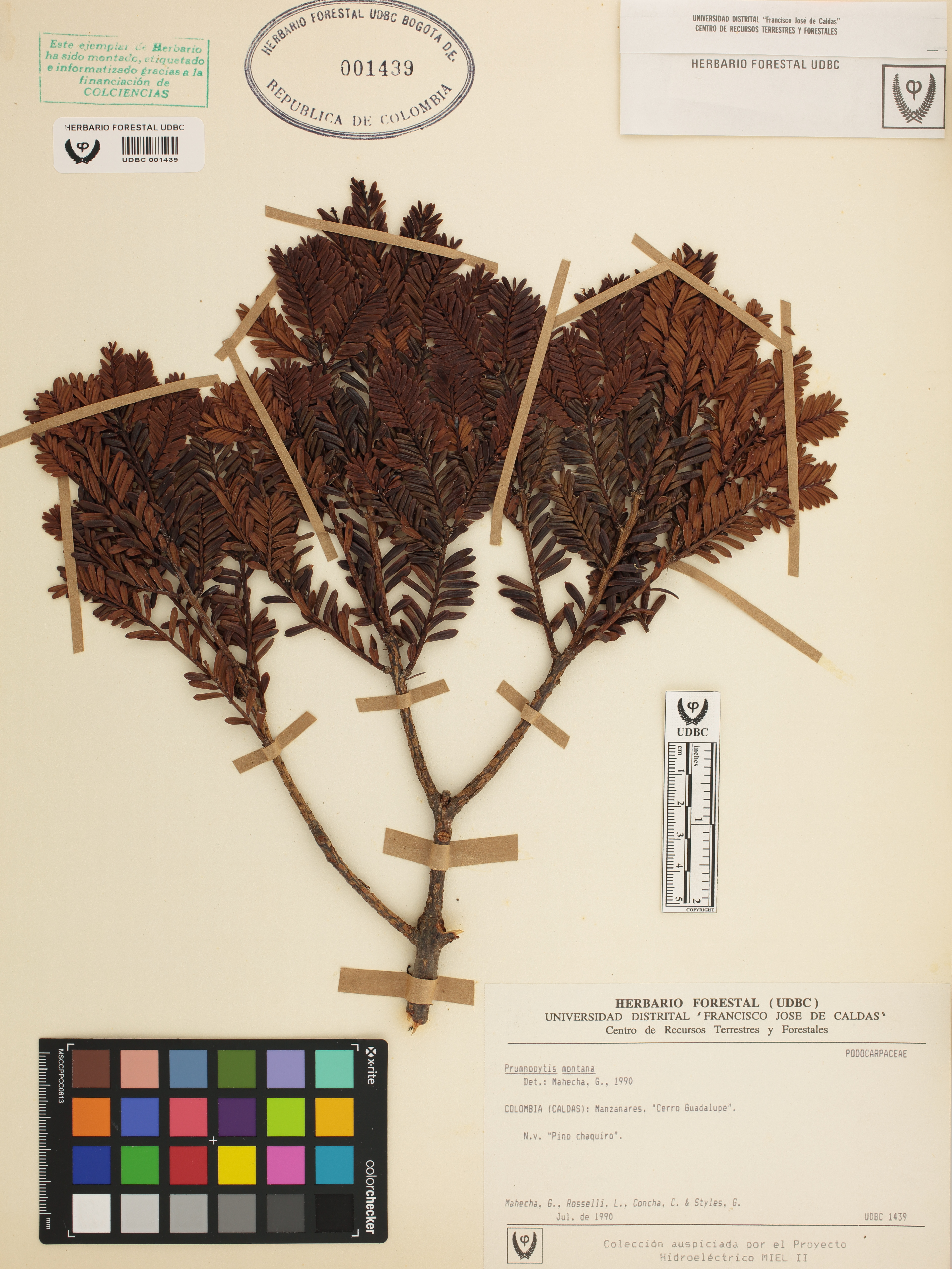Fotografía del ejemplar Mahecha, G., determinado como Prumnopitys montana en el año 1990
