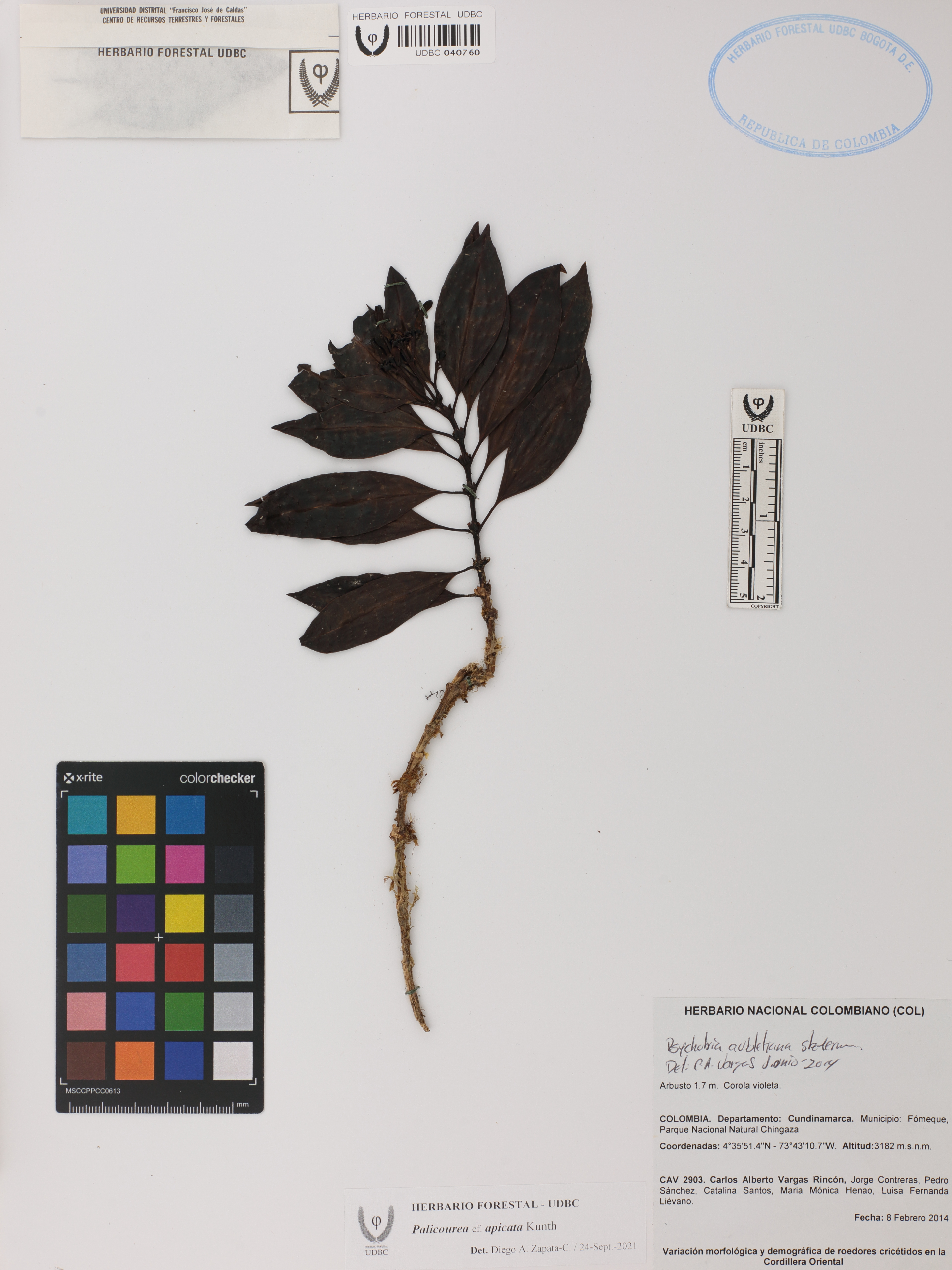 Fotografía del ejemplar Vargas, C. 2903, determinado como Palicourea apicata en el año 2021