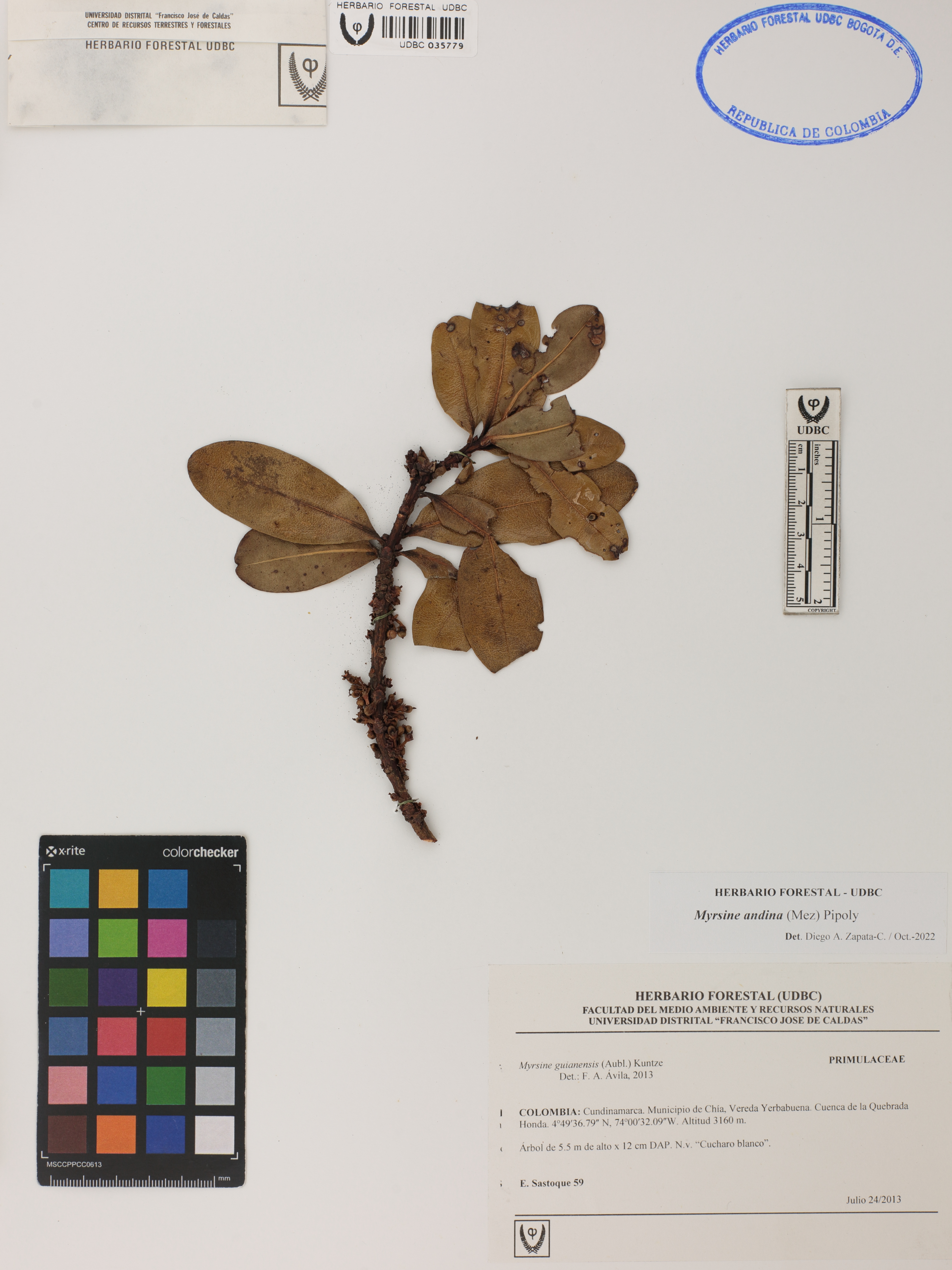 Fotografía del ejemplar Sastoque, E. 59, determinado como Myrsine andina en el año 2022