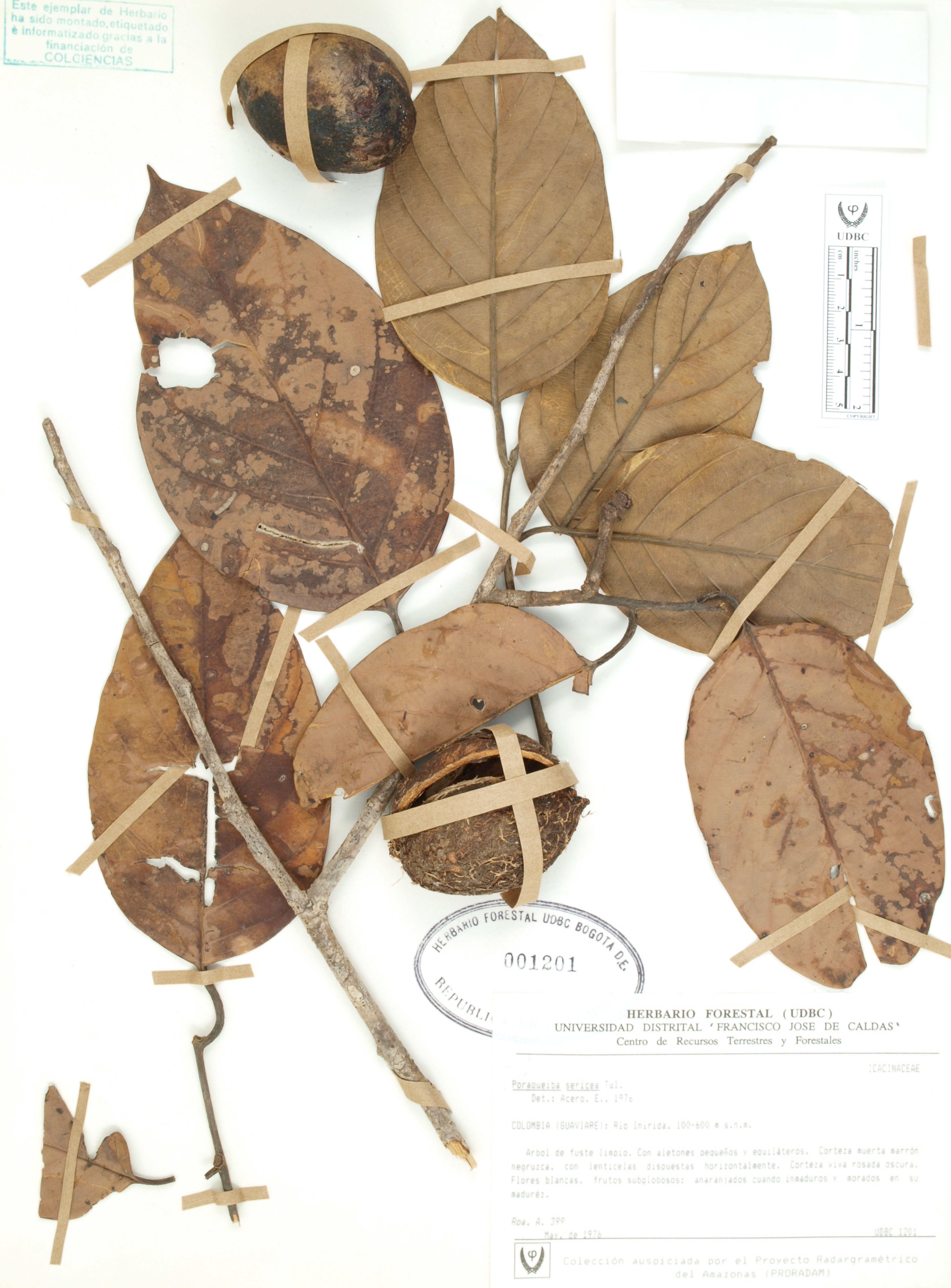 Fotografía del ejemplar Roa, A. 399, determinado como Poraqueiba sericea en el año 1976