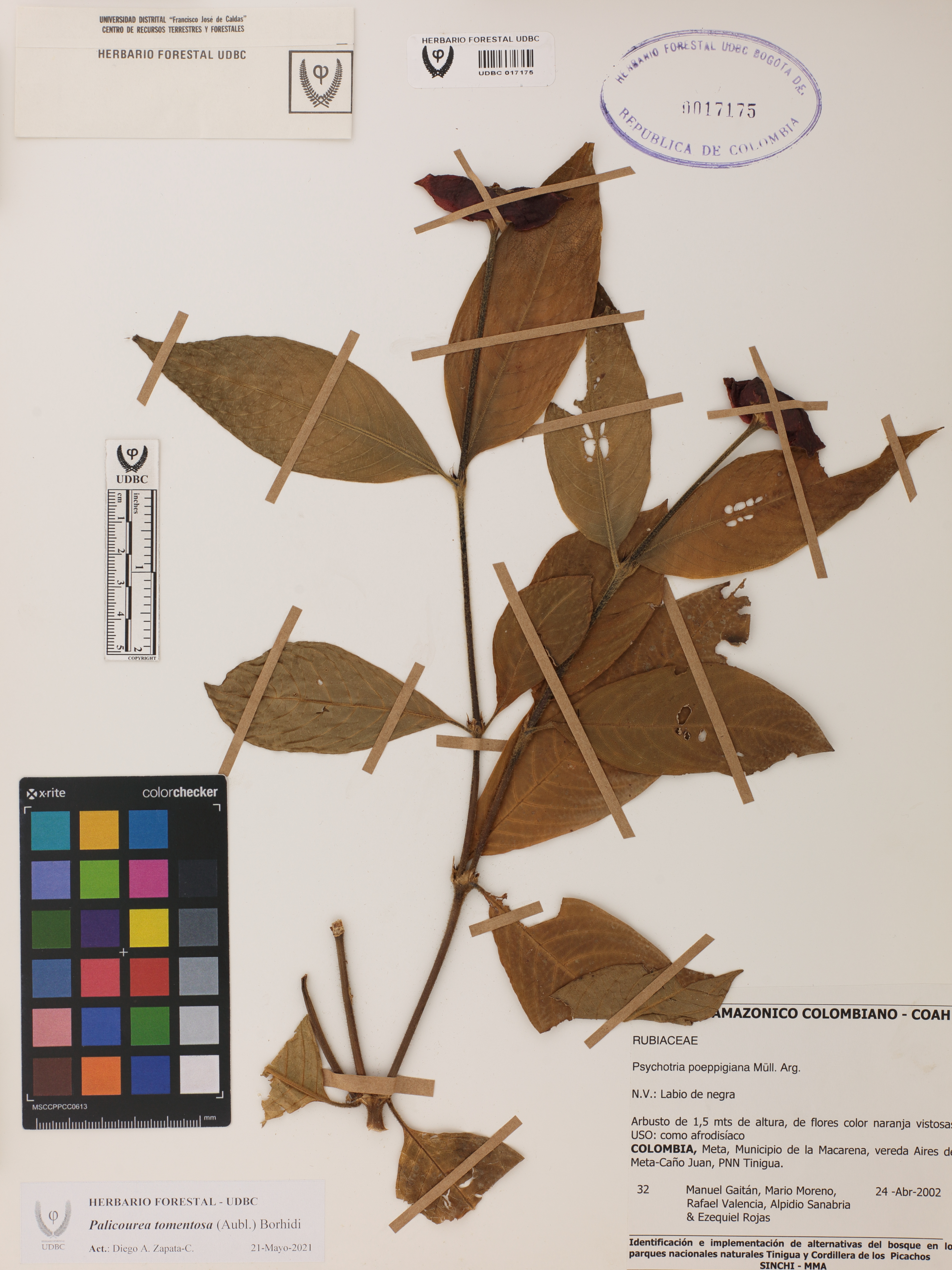 Fotografía del ejemplar Gaitán, M. 32, determinado como Palicourea tomentosa