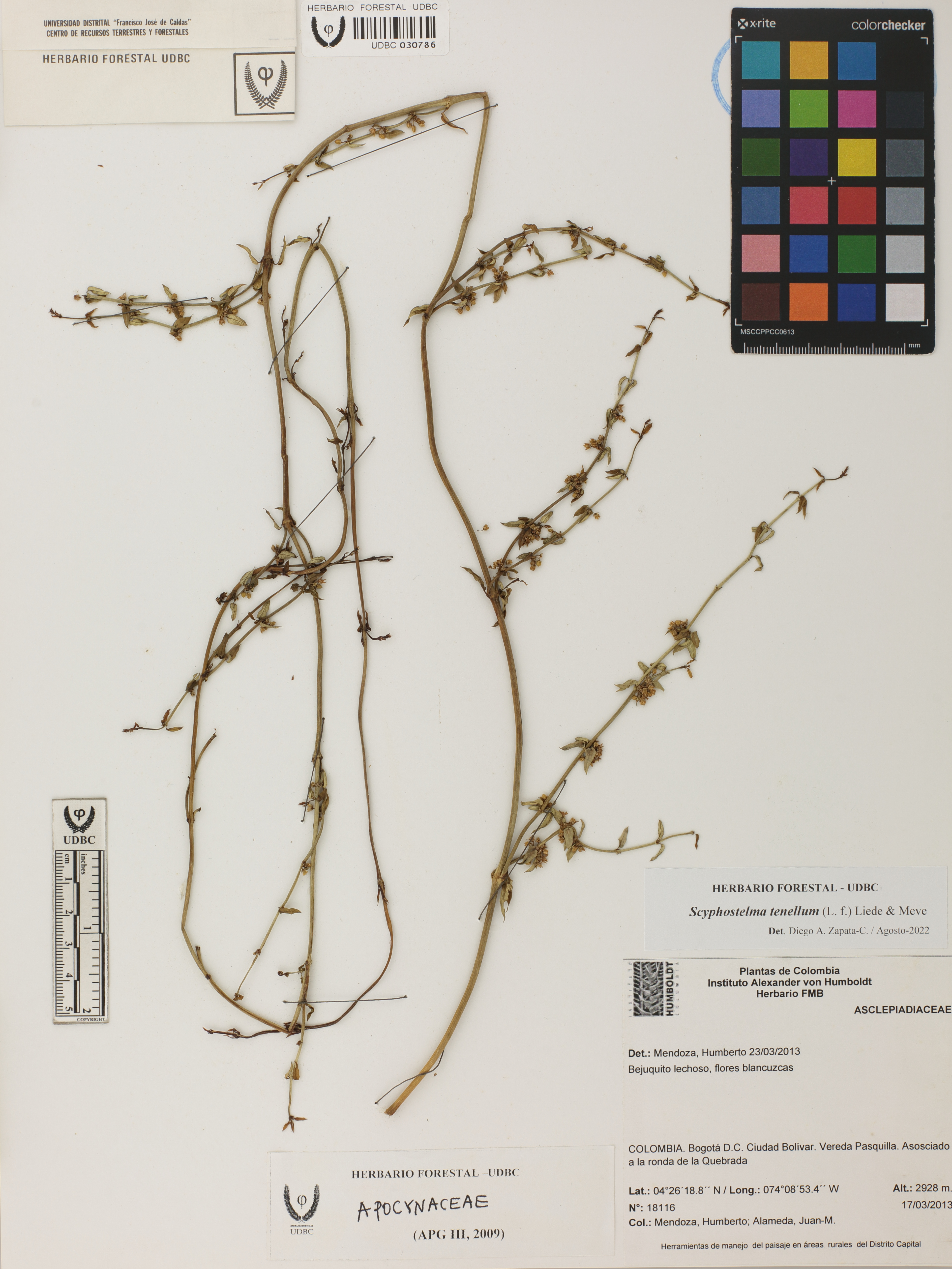 Fotografía del ejemplar Mendoza, H. 18116, determinado como Scyphostelma tenellum en el año 2022